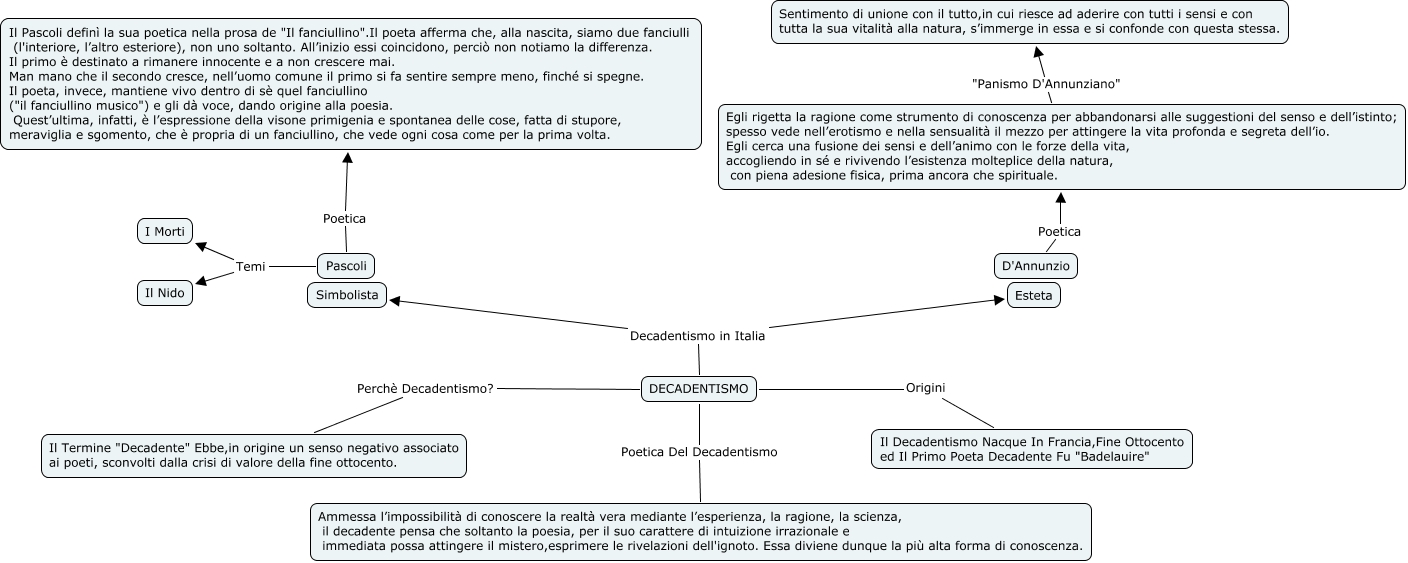 Questa Mappa Concettuale ha informazioni correlate a: Decadentismo, D'Annunzio Poetica Egli rigetta la ragione come strumento di conoscenza per abbandonarsi alle suggestioni del senso e dell’istinto; spesso vede nell’erotismo e nella sensualità il mezzo per attingere la vita profonda e segreta dell’io. Egli cerca una fusione dei sensi e dell’animo con le forze della vita, accogliendo in sé e rivivendo l’esistenza molteplice della natura, con piena adesione fisica, prima ancora che spirituale., Pascoli Poetica Il Pascoli definì la sua poetica nella prosa de "Il fanciullino".Il poeta afferma che, alla nascita, siamo due fanciulli (l'interiore, l’altro esteriore), non uno soltanto. All’inizio essi coincidono, perciò non notiamo la differenza. Il primo è destinato a rimanere innocente e a non crescere mai. Man mano che il secondo cresce, nell’uomo comune il primo si fa sentire sempre meno, finché si spegne. Il poeta, invece, mantiene vivo dentro di sè quel fanciullino ("il fanciullino musico") e gli dà voce, dando origine alla poesia. Quest’ultima, infatti, è l’espressione della visone primigenia e spontanea delle cose, fatta di stupore, meraviglia e sgomento, che è propria di un fanciullino, che vede ogni cosa come per la prima volta., DECADENTISMO Origini Il Decadentismo Nacque In Francia,Fine Ottocento ed Il Primo Poeta Decadente Fu "Badelauire", Egli rigetta la ragione come strumento di conoscenza per abbandonarsi alle suggestioni del senso e dell’istinto; spesso vede nell’erotismo e nella sensualità il mezzo per attingere la vita profonda e segreta dell’io. Egli cerca una fusione dei sensi e dell’animo con le forze della vita, accogliendo in sé e rivivendo l’esistenza molteplice della natura, con piena adesione fisica, prima ancora che spirituale. "Panismo D'Annunziano" Sentimento di unione con il tutto,in cui riesce ad aderire con tutti i sensi e con tutta la sua vitalità alla natura, s’immerge in essa e si confonde con questa stessa., DECADENTISMO Decadentismo in Italia Esteta, DECADENTISMO Perchè Decadentismo? Il Termine "Decadente" Ebbe,in origine un senso negativo associato ai poeti, sconvolti dalla crisi di valore della fine ottocento., Pascoli Temi I Morti, Pascoli Temi Il Nido, DECADENTISMO Decadentismo in Italia Simbolista, DECADENTISMO Poetica Del Decadentismo Ammessa l’impossibilità di conoscere la realtà vera mediante l’esperienza, la ragione, la scienza, il decadente pensa che soltanto la poesia, per il suo carattere di intuizione irrazionale e immediata possa attingere il mistero,esprimere le rivelazioni dell'ignoto. Essa diviene dunque la più alta forma di conoscenza.