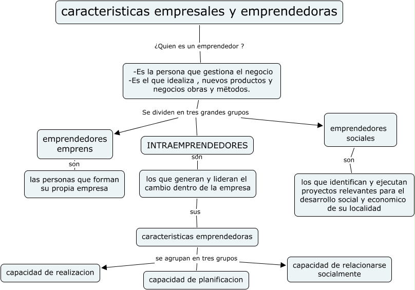 Este Cmap, tiene información relacionada con: emprendedores alison melvi elizabet, -Es la persona que gestiona el negocio -Es el que idealiza , nuevos productos y negocios obras y mëtodos. Se dividen en tres grandes grupos emprendedores sociales, caracteristicas emprendedoras se agrupan en tres grupos capacidad de realizacion, caracteristicas emprendedoras se agrupan en tres grupos capacidad de relacionarse socialmente, los que generan y lideran el cambio dentro de la empresa sus caracteristicas emprendedoras, INTRAEMPRENDEDORES son los que generan y lideran el cambio dentro de la empresa, emprendedores emprens son las personas que forman su propia empresa, -Es la persona que gestiona el negocio -Es el que idealiza , nuevos productos y negocios obras y mëtodos. Se dividen en tres grandes grupos emprendedores emprens, -Es la persona que gestiona el negocio -Es el que idealiza , nuevos productos y negocios obras y mëtodos. Se dividen en tres grandes grupos INTRAEMPRENDEDORES, caracteristicas empresales y emprendedoras ¿Quien es un emprendedor ? -Es la persona que gestiona el negocio -Es el que idealiza , nuevos productos y negocios obras y mëtodos., caracteristicas emprendedoras se agrupan en tres grupos capacidad de planificacion, emprendedores sociales son los que identifican y ejecutan proyectos relevantes para el desarrollo social y economico de su localidad