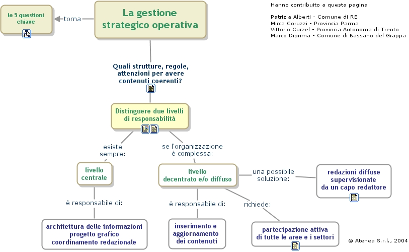 gestione, partecipazione attiva di tutte le aree e i settori, redazioni diffuse supervisionate da un capo redattore, livello decentrato e o diffuso, le 5 questioni chiave, inserimento e aggiornamento dei contenuti, hanno contribuito a questa pagina patrizia alberti - comune di re mirca coruzzi - provincia parma vittorio curzel - provincia autonoma di trento marco diprima - comune di bassano del grappa, architettura delle informazioni progetto grafico coordinamento redazionale, � atenea s.r.l., 2004, la gestione strategico operativa, distinguere due livelli di responsabilit�, livello centrale