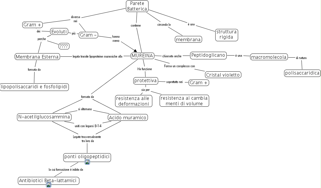 parete batterica ricstemarlauben, struttura rigida, protettiva, resistenza alle deformazioni, resistenza ai cambia menti di volume, cristal violetto, membrana, gram -, macromolecola, polisaccaridica, acido muramico, ????, parete batterica, evoluti, mureina, gram , peptidoglicano, n-acetilglucosammina, membrana esterna, lipopolisaccaridi e fosfolipidi, gram , ponti oligopeptidici, antibiotici beta-lattamici