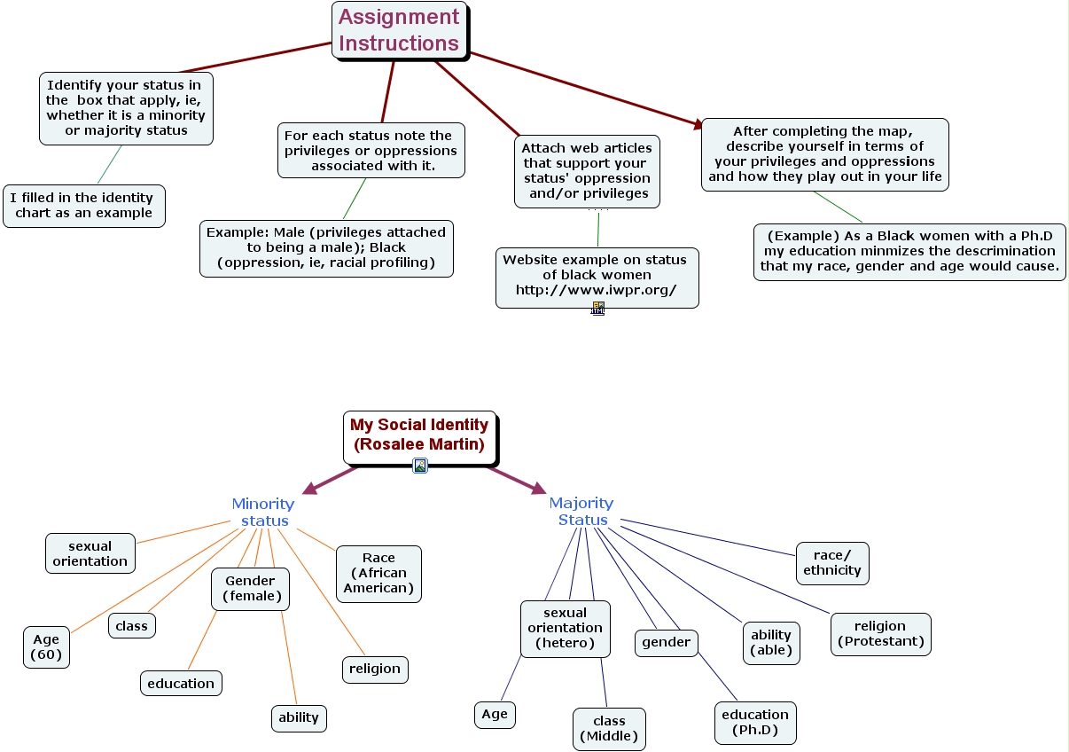 social justice assignment, identify your status in the box that apply, ie, whether it is a minority or majority status, ability, sexual orientation, class (middle), sexual orientation (hetero), website example on status of black women http www.iwpr.org , attach web articles that support your status' oppression and or privileges, education (ph.d), race ethnicity, religion, (example) as a black women with a ph.d my education minmizes the descrimination that my race, gender and age would cause., after completing the map, describe yourself in terms of your privileges and oppressions and how they play out in your life, i filled in the identity chart as an example, age (60), gender, age, example male (privileges attached to being a male) black (oppression, ie, racial profiling), my social identity (rosalee martin), ability (able), religion (protestant), assignment instructions, gender (female), education, class, for each status note the privileges or oppressions associated with it., race (african american)