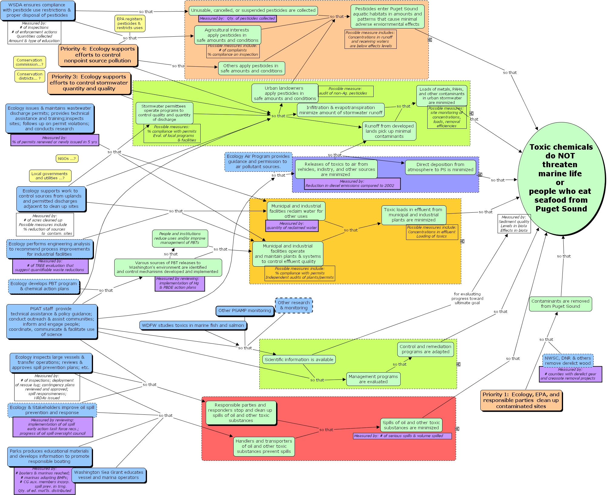 WSDA ensures compliance with pesticide use restrictions & proper disposal of pesticides so that Agricultural interests apply pesticides in safe amounts and conditions, Infiltration & evapotranspiration minimize amount of stormwater runoff so that Loads of metals, PAHs, and other contaminants in urban stormwater are minimized, Ecology performs engineering analysis to recommend process improvements for industrial facilities so that Municipal and industrial facilities operate and maintain plants & systems to control effluent quality, Ecology performs engineering analysis to recommend process improvements for industrial facilities so that Municipal and industrial facilities reclaim water for other uses, PSAT staff provide technical assistance & policy guidance; conduct outreach & assist communities; inform and engage people; coordinate, communicate & facilitate use of science so that Scientific information is available, Ecology supports work to control sources from uplands and permitted discharges adjacent to clean up sites so that Municipal and industrial facilities operate and maintain plants & systems to control effluent quality, Ecology supports work to control sources from uplands and permitted discharges adjacent to clean up sites so that Municipal and industrial facilities reclaim water for other uses, Ecology inspects large vessels & transfer operations; reviews & approves spill prevention plans; etc. so that Responsible parties and responders stop and clean up spills of oil and other toxic substances, Toxic loads in effluent from municipal and industrial plants are minimized so that Toxic chemicals do NOT threaten marine life or people who eat seafood from Puget Sound, Other research & monitoring so that Scientific information is available, Agricultural interests apply pesticides in safe amounts and conditions so that Pesticides enter Puget Sound aquatic habitats in amounts and patterns that cause minimal adverse enviornmental effects, Priority 4: Ecology supports efforts to control nonpoint source pollution so that Infiltration & evapotranspiration minimize amount of stormwater runoff, Priority 4: Ecology supports efforts to control nonpoint source pollution so that Urban landowners apply pesticides in safe amounts and conditions, Priority 4: Ecology supports efforts to control nonpoint source pollution so that Runoff from developed lands pick up minimal contaminants, Runoff from developed lands pick up minimal contaminants so that Loads of metals, PAHs, and other contaminants in urban stormwater are minimized, Contaminants are removed from Puget Sound so that Toxic chemicals do NOT threaten marine life or people who eat seafood from Puget Sound, Ecology inspects large vessels & transfer operations; reviews & approves spill prevention plans; etc. so that Handlers and transporters of oil and other toxic substances prevent spills, Ecology supports work to control sources from uplands and permitted discharges adjacent to clean up sites so that Infiltration & evapotranspiration minimize amount of stormwater runoff, Ecology supports work to control sources from uplands and permitted discharges adjacent to clean up sites so that Urban landowners apply pesticides in safe amounts and conditions, Ecology supports work to control sources from uplands and permitted discharges adjacent to clean up sites so that Runoff from developed lands pick up minimal contaminants, Priority 4: Ecology supports efforts to control nonpoint source pollution so that Others apply pesticides in safe amounts and conditions, Ecology issues & maintains wastewater discharge permits; provides technical assistance and training;inspects sites; follows up on permit violations; and conducts research so that Stormwater permittees operate programs to control quality and quantity of discharge, Ecology issues & maintains wastewater discharge permits; provides technical assistance and training;inspects sites; follows up on permit violations; and conducts research so that Municipal and industrial facilities operate and maintain plants & systems to control effluent quality, Ecology issues & maintains wastewater discharge permits; provides technical assistance and training;inspects sites; follows up on permit violations; and conducts research so that Municipal and industrial facilities reclaim water for other uses, Other PSAMP monitoring so that Scientific information is available, Stormwater permittees operate programs to control quality and quantity of discharge so that Infiltration & evapotranspiration minimize amount of stormwater runoff, Stormwater permittees operate programs to control quality and quantity of discharge so that Urban landowners apply pesticides in safe amounts and conditions, Stormwater permittees operate programs to control quality and quantity of discharge so that Runoff from developed lands pick up minimal contaminants, PSAT staff provide technical assistance & policy guidance; conduct outreach & assist communities; inform and engage people; coordinate, communicate & facilitate use of science so that Management programs are evaluated, EPA registers pesticides & restricts uses so that Agricultural interests apply pesticides in safe amounts and conditions, Priority 3: Ecology supports efforts to control stormwater quantity and quality so that Stormwater permittees operate programs to control quality and quantity of discharge, Direct deposition from atmosphere to PS is minimized so that Toxic chemicals do NOT threaten marine life or people who eat seafood from Puget Sound, WSDA ensures compliance with pesticide use restrictions & proper disposal of pesticides so that Unusable, cancelled, or suspended pesticides are collected, PSAT staff provide technical assistance & policy guidance; conduct outreach & assist communities; inform and engage people; coordinate, communicate & facilitate use of science so that Varous sources of PBT releases to Washington's environment are identified and control mechanisms develo