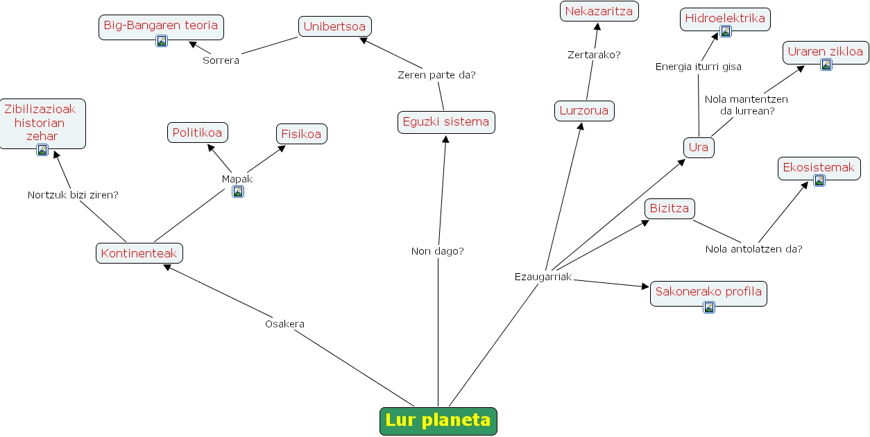 Eguzki sistema Zeren parte da? Unibertsoa, Bizitza Nola antolatzen da? Ekosistemak, Ura Energia iturri gisa Hidroelektrika, Kontinenteak Mapak Politikoa, Kontinenteak Mapak Fisikoa, Ura Nola mantentzen da lurrean? Uraren zikloa, Unibertsoa Sorrera Big-Bangaren teoria, Lur planeta Ezaugarriak Sakonerako profila, Lur planeta Ezaugarriak Lurzorua, Lur planeta Ezaugarriak Ura, Lur planeta Ezaugarriak Bizitza, Lur planeta Osakera Kontinenteak, Lurzorua Zertarako? Nekazaritza, Lur planeta Non dago? Eguzki sistema, Kontinenteak Nortzuk bizi ziren? Zibilizazioak historian zehar