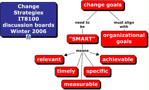 ChangeGoals, "SMART" means specific, "SMART" means relevant, change goals must align with organizational goals, change goals need to be "SMART", "SMART" means measurable, "SMART" means achievable, "SMART" means timely