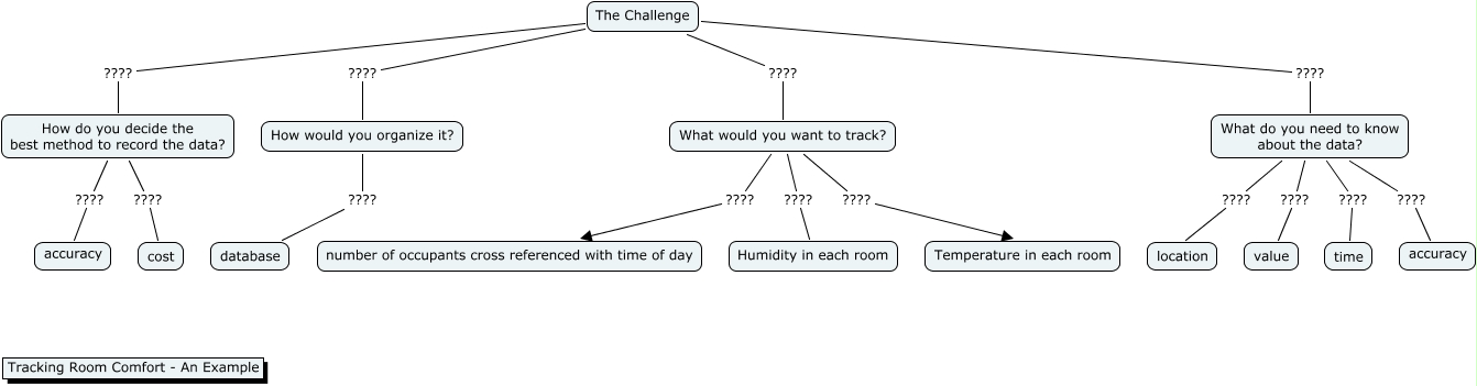 dave Jaffe Room Comfort Example Week-3, The Challenge ???? How would you organize it?, What would you want to track? ???? number of occupants cross referenced with time of day, What do you need to know about the data? ???? location, What do you need to know about the data? ???? accuracy, How would you organize it? ???? database, The Challenge ???? How do you decide the best method to record the data?, What do you need to know about the data? ???? value, How do you decide the best method to record the data? ???? accuracy, How do you decide the best method to record the data? ???? cost, What do you need to know about the data? ???? time