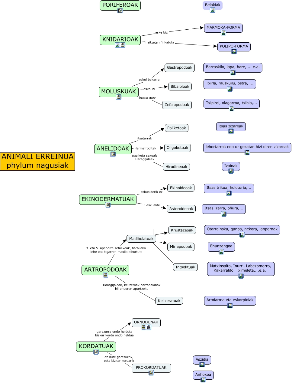 This Concept Map, created with IHMC CmapTools, has information related to: Animali Erreinua, MOLUSKUAK oskol bakarra Gastropodoak, ANELIDOAK ugalketa sexuala Haragijaleak Hirudineoak, MOLUSKUAK burua dute Zefalopodoak, KORDATUAK ez dute garezurrik, ezta bizkar kordarik PROKORDATUAK, ARTROPODOAK Haragijaleak, kelizeroak harrapakinak hil ondoren apurtzeko Kelizeratuak, EKINODERMATUAK 5 eskualde Asteroideoak, Madibulatuak Krustazeoak, Madibulatuak Intsektuak, KORDATUAK garezurra ondo helduta bizkar korda ondo heldua ORNODUNAK, Madibulatuak Miriapodoak, ANELIDOAK Hermafroditak Oligoketoak, EKINODERMATUAK eskualderik ez Ekinoideoak, ANELIDOAK itsatarrak Poliketoak, ARTROPODOAK 3. eta 5. apendize zefalikoak, barailako lehe eta bigarren maxila bihurtuta Madibulatuak, MOLUSKUAK oskol bi Bibalbioak, KNIDARIOAK haitzetan finkatuta POLIPO-FORMA, KNIDARIOAK aske bizi MARMOKA-FORMA