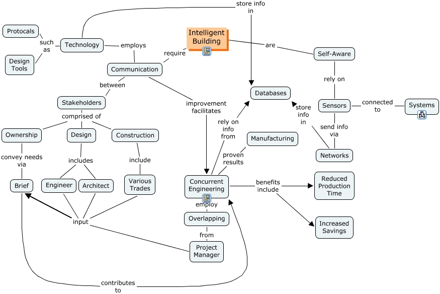 A4 Final, Intelligent Building are Self-Aware, Concurrent Engineering benefits include Reduced Production Time, Technology store info in Databases, Communication employs Technology, Stakeholders comprised of Design, Overlapping from Project Manager, Concurrent Engineering employ Overlapping, Engineer input Brief, Engineer input Various Trades, Communication improvement facilitates Concurrent Engineering