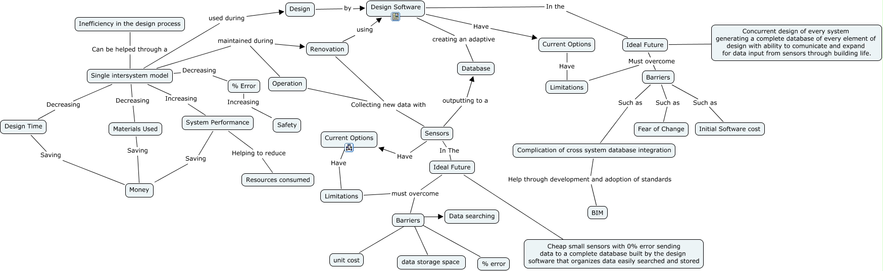 Single Intersystem Building Life Model, Barriers ???? data storage space, Renovation Collecting new data with Sensors, % Error Increasing Safety, Single intersystem model Decreasing Materials Used, Single intersystem model maintained during Operation, Single intersystem model Decreasing Design Time, Limitations must overcome Barriers, Sensors In The Ideal Future, Inefficiency in the design process Can be helped through a Single intersystem model, Design by Design Software