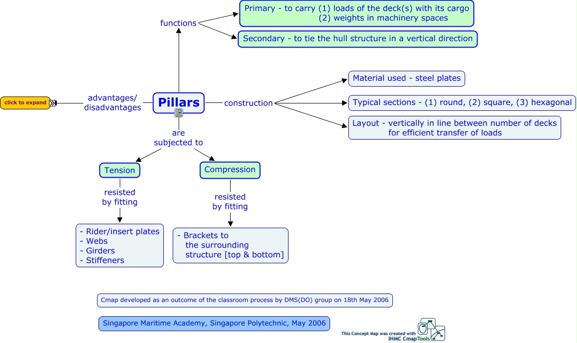 Pillars, Tension resisted by fitting - Rider/insert plates - Webs - Girders - Stiffeners, Pillars are subjected to Tension, Pillars construction Typical sections - (1) round, (2) square, (3) hexagonal, Pillars functions Primary - to carry (1) loads of the deck(s) with its cargo (2) weights in machinery spaces, Pillars construction Material used - steel plates, Pillars construction Layout - vertically in line between number of decks for efficient transfer of loads, Pillars functions Secondary - to tie the hull structure in a vertical direction, Pillars are subjected to Compression, Compression resisted by fitting - Brackets to the surrounding structure [top & bottom], Pillars advantages/ disadvantages click to expand