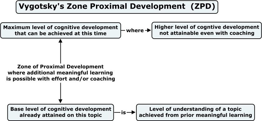 Vygotsky's Zone of Proximal Development, Base level of cognitive development already attained on this topic is Level of understanding of a topic achieved from prior meaningful learning, Maximum level of cognitive development that can be achieved at this time where Higher level of cogntive development not attainable even with coaching