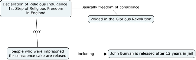 This Concept Map, created with IHMC CmapTools, has information related to: Declaration of Religious Indulgence, Declaration of Religious Indulgence: 1st Step of Religious Freedom in England Basically freedom of conscience Voided in the Glorious Revolution, people who were imprisoned for conscience sake are relased including John Bunyan is released after 12 years in jail, Declaration of Religious Indulgence: 1st Step of Religious Freedom in England ???? people who were imprisoned for conscience sake are relased