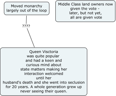 1832 Reform Act, Moved monarchy largely out of the loop ???? Queen Visctoria was quite popular and had a keen and curious mind about state matters making her interaction welcomed until her husband's death and she went into seclusion for 20 years. A whole generation grew up never seeing their queen.