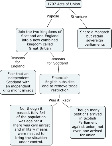 1707 Act of Union, Financial- English subsidies and to remove trade restriction Was it liked? No, though it passed, fully 3/4 of the population was against it. There was civil unrest and military means were needed to bring the situation under control., 1707 Acts of Union Structure Share a Monarch but retain sovereign parliaments, 1707 Acts of Union Pupose Join the two kingdoms of Scotland and England into a new combined kingdom called Great Britian, Join the two kingdoms of Scotland and England into a new combined kingdom called Great Britian Reasons for England Fear that an independent Scotland with an indpendent king might invade, Join the two kingdoms of Scotland and England into a new combined kingdom called Great Britian Reasons for Scotland Financial- English subsidies and to remove trade restriction, Financial- English subsidies and to remove trade restriction Was it liked? Though many petitions arrived in Scotish Parliament against union, not even one arrived for union