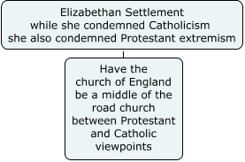 Elizabethan Settlement, Elizabethan Settlement while she condemned Catholicism she also condemned Protestant extremism Her solution Have the church of England be a middle of the road church between Protestant and Catholic viewpoints