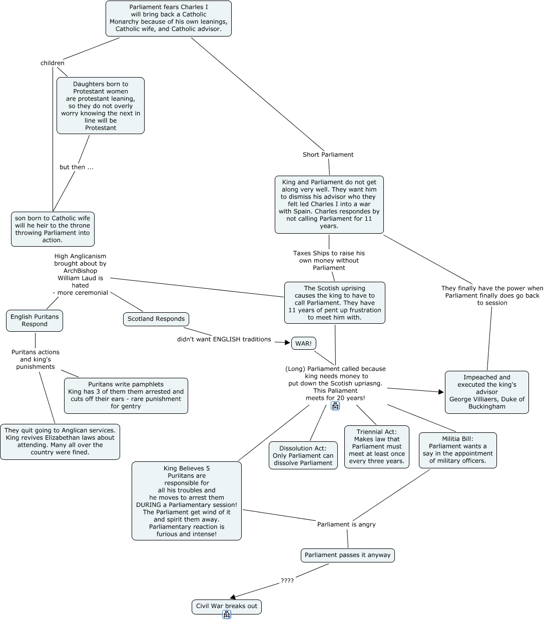 Long Parliament, The Scotish uprising causes the king to have to call Parliament. They have 11 years of pent up frustration to meet him with. (Long) Parliament called because king needs money to put down the Scotish upriasng. This Paliament meets for 20 years! Impeached and executed the king's advisor George Villiaers, Duke of Buckingham, Parliament fears Charles I will bring back a Catholic Monarchy because of his own leanings, Catholic wife, and Catholic advisor. children son born to Catholic wife will he heir to the throne throwing Parliament into action., English Puritans Respond Puritans actions and king's punishments Puritans write pamphlets King has 3 of them them arrested and cuts off their ears - rare punishment for gentry, The Scotish uprising causes the king to have to call Parliament. They have 11 years of pent up frustration to meet him with. (Long) Parliament called because king needs money to put down the Scotish upriasng. This Paliament meets for 20 years! King Believes 5 Puriitans are responsible for all his troubles and he moves to arrest them DURING a Parliamentary session! The Parliament get wind of it and spirit them away. Parliamentary reaction is furious and intense!, WAR! (Long) Parliament called because king needs money to put down the Scotish upriasng. This Paliament meets for 20 years! Triennial Act: Makes law that Parliament must meet at least once every three years., The Scotish uprising causes the king to have to call Parliament. They have 11 years of pent up frustration to meet him with. (Long) Parliament called because king needs money to put down the Scotish upriasng. This Paliament meets for 20 years! Triennial Act: Makes law that Parliament must meet at least once every three years., Militia Bill: Parliament wants a say in the appointment of military officers. Parliament is angry Parliament passes it anyway, King and Parliament do not get along very well. They want him to dismiss his advisor who they felt led Charles I into a war with Spain. Charles respondes by not calling Parliament for 11 years. Taxes Ships to raise his own money without Parliament The Scotish uprising causes the king to have to call Parliament. They have 11 years of pent up frustration to meet him with., English Puritans Respond Puritans actions and king's punishments They quit going to Anglican services. King revives Elizabethan laws about attending. Many all over the country were fined., The Scotish uprising causes the king to have to call Parliament. They have 11 years of pent up frustration to meet him with. (Long) Parliament called because king needs money to put down the Scotish upriasng. This Paliament meets for 20 years! Dissolution Act: Only Parliament can dissolve Parliament