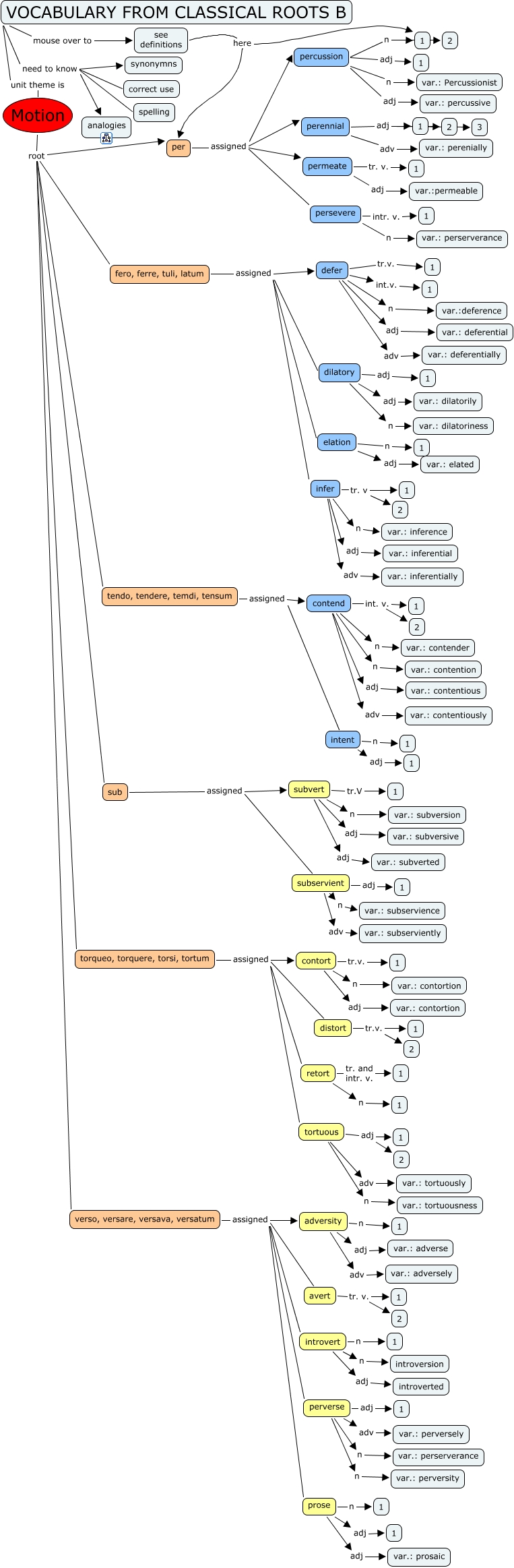 This Concept Map has information related to: 01 02 Motion, contort tr.v. 1, contend int. v. 2, adversity adj var.: adverse, subvert adj var.: subverted, torqueo, torquere, torsi, tortum assigned retort, elation n 1, contend n var.: contention, perverse n var.: perserverance, VOCABULARY FROM CLASSICAL ROOTS B need to know synonymns, perennial adj 2