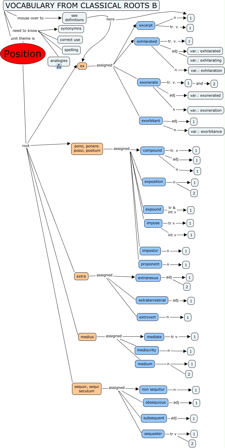 This Concept Map has information related to: 03 04 Position, VOCABULARY FROM CLASSICAL ROOTS B need to know correct use, medius assigned mediocrity, 1 and 2, pono, ponere. posui, positum assigned impose, exposition n 1, Position root ex, sequester tr v 1, pono, ponere. posui, positum assigned expound, sequor, sequi secutum assigned obsequious, compound tr. v 1