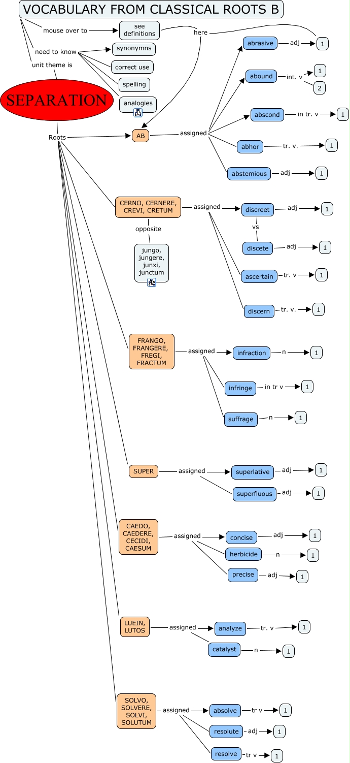 This Concept Map has information related to: 07 08 Separation, absolve tr v 1, suffrage n 1, SUPER assigned superfluous, AB assigned abound, FRANGO, FRANGERE, FREGI, FRACTUM assigned infraction, superlative adj 1, SEPARATION Roots AB, AB assigned abscond, abscond in tr. v 1, herbicide n 1