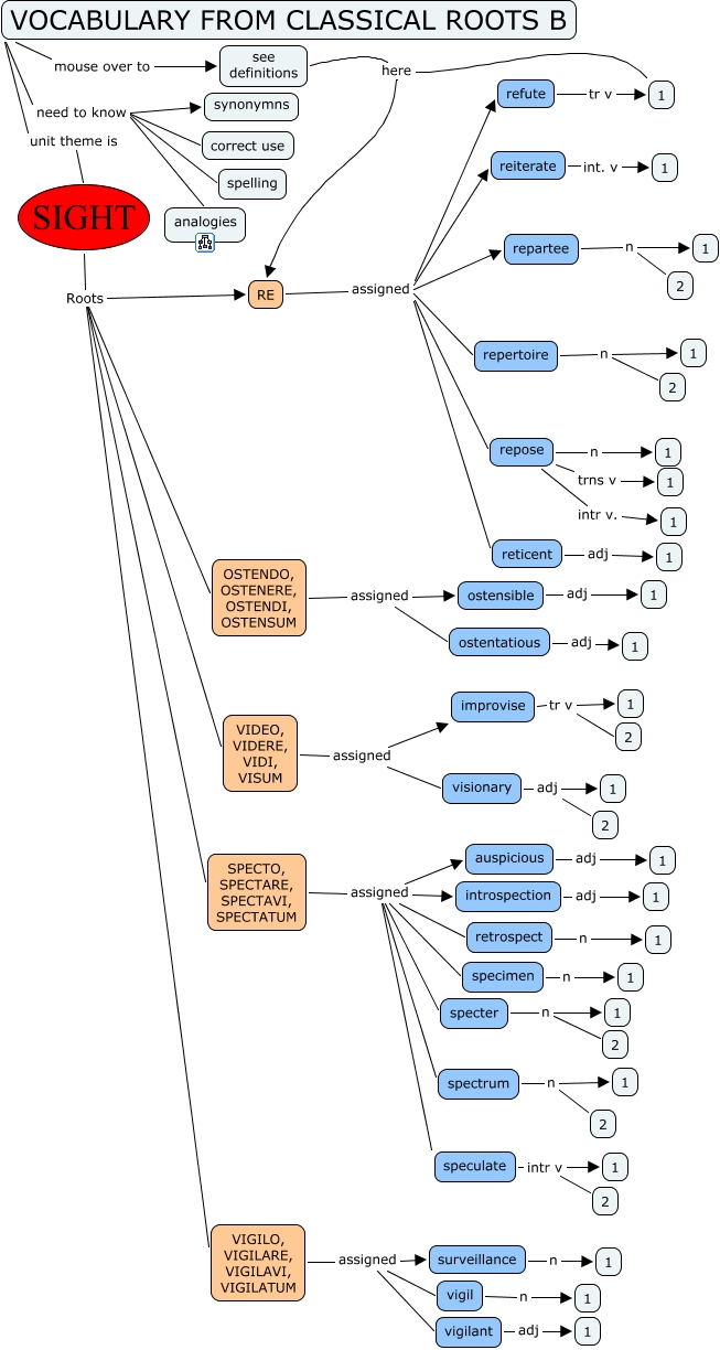 This Concept Map has information related to: 09 10 Sight, RE assigned repose, vigilant adj 1, spectrum n 1, repartee n 1, SIGHT Roots RE, specter n 2, RE assigned repertoire, VIGILO, VIGILARE, VIGILAVI, VIGILATUM assigned vigil, VOCABULARY FROM CLASSICAL ROOTS B unit theme is SIGHT, SPECTO, SPECTARE, SPECTAVI, SPECTATUM assigned auspicious
