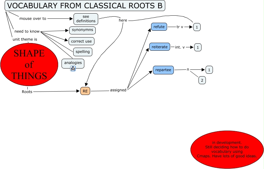 This Concept Map has information related to: 15 16 The Shapes of Things, RE assigned reiterate, repartee n 1, VOCABULARY FROM CLASSICAL ROOTS B need to know analogies, VOCABULARY FROM CLASSICAL ROOTS B unit theme is SHAPE of THINGS, RE assigned refute, VOCABULARY FROM CLASSICAL ROOTS B need to know correct use, RE assigned repartee, see definitions here 1, VOCABULARY FROM CLASSICAL ROOTS B need to know synonymns, VOCABULARY FROM CLASSICAL ROOTS B need to know spelling
