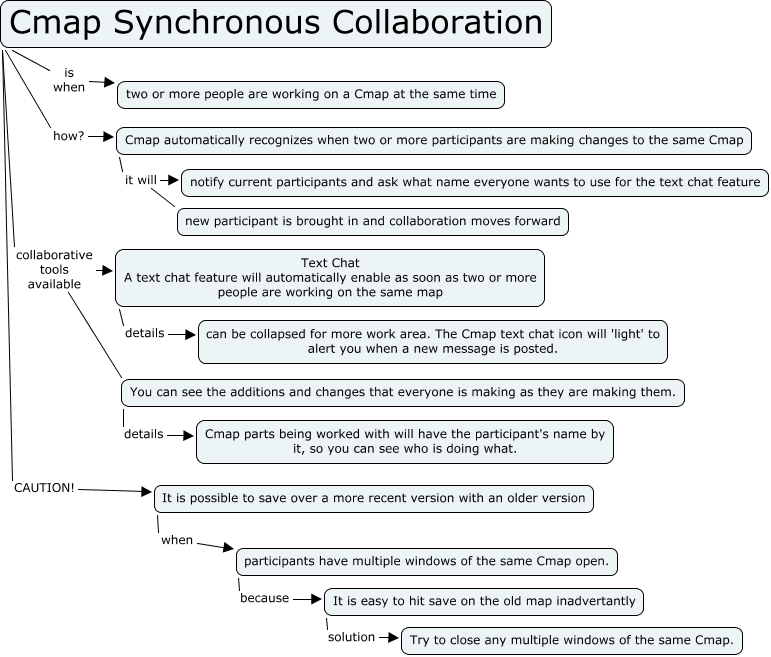 Synchronous Collaboration, Cmap Synchronous Collaboration collaborative tools available You can see the additions and changes that everyone is making as they are making them., You can see the additions and changes that everyone is making as they are making them. details Cmap parts being worked with will have the participant's name by it, so you can see who is doing what., Cmap automatically recognizes when two or more participants are making changes to the same Cmap it will new participant is brought in and collaboration moves forward, Cmap automatically recognizes when two or more participants are making changes to the same Cmap it will notify current participants and ask what name everyone wants to use for the text chat feature, It is possible to save over a more recent version with an older version when participants have multiple windows of the same Cmap open., Cmap Synchronous Collaboration CAUTION! It is possible to save over a more recent version with an older version, It is easy to hit save on the old map inadvertantly solution Try to close any multiple windows of the same Cmap., participants have multiple windows of the same Cmap open. because It is easy to hit save on the old map inadvertantly, Cmap Synchronous Collaboration how? Cmap automatically recognizes when two or more participants are making changes to the same Cmap, Cmap Synchronous Collaboration collaborative tools available Text Chat A text chat feature will automatically enable as soon as two or more people are working on the same map