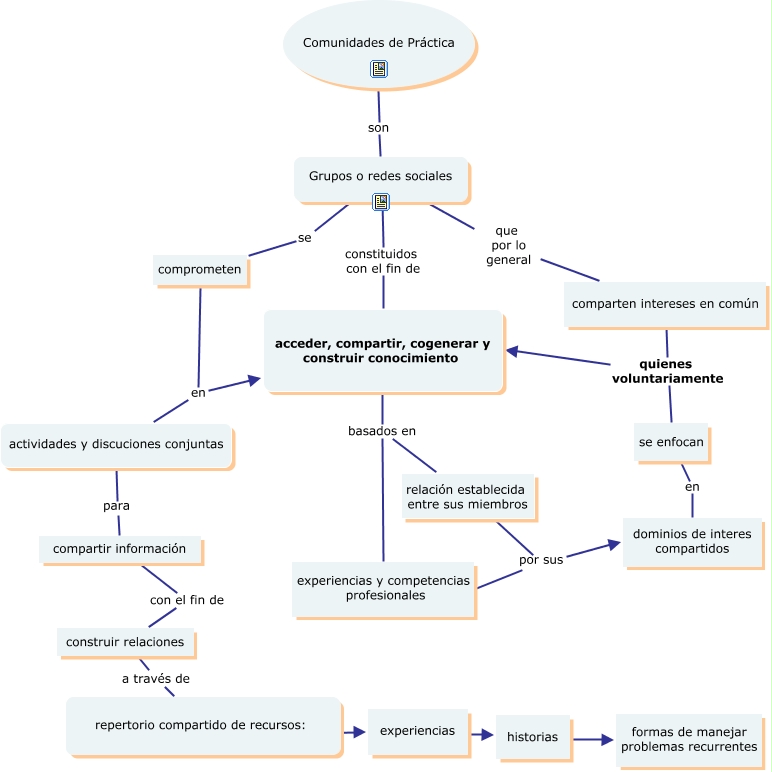 Mapa Conceptual sobrel sobre las Comunidades de Práctica, relación establecida entre sus miembros por sus dominios de interes compartidos, comparten intereses en común quienes voluntariamente acceder, compartir, cogenerar y construir conocimiento, comparten intereses en común quienes voluntariamente se enfocan, acceder, compartir, cogenerar y construir conocimiento basados en experiencias y competencias profesionales, comprometen en actividades y discuciones conjuntas, repertorio compartido de recursos: ???? experiencias, acceder, compartir, cogenerar y construir conocimiento basados en relación establecida entre sus miembros, Grupos o redes sociales se comprometen, construir relaciones a través de repertorio compartido de recursos:, experiencias ???? historias