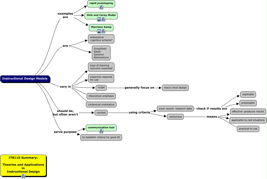 ID_Models_IT8110_Summary, Instructional Design Models serve purpose communication tool, Instructional Design Models examples are rapid prototyping, Instructional Design Models examples are Dick and Carey Model, Instructional Design Models are Simplified/ Ideal/ Generic/ Abstractions, Instructional Design Models should be, but often aren't verified, usefulness means applicable to real situations, Instructional Design Models vary in expertise required for use, Instructional Design Models vary in scope, Instructional Design Models vary in type of learning outcome expected, Instructional Design Models vary in contextual oreintation