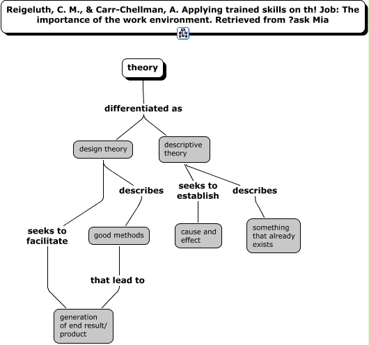 theory_Reigeluth_Carr-Chellman_askMia, design theory seeks to facilitate generation of end result/ product, good methods that lead to generation of end result/ product, theory differentiated as descriptive theory, descriptive theory seeks to establish cause and effect, design theory describes good methods, descriptive theory describes something that already exists, theory differentiated as design theory