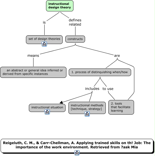 instructionalDesignTheory_Reigeluth_Carr-Chellman_askMia, constructs are 1. process of distinquishing when/how, 1. process of distinquishing when/how includes instructioinal methods [technique, strategy], 1. process of distinquishing when/how includes instructional situation, constructs are 2. tools that facilitate learning, constructs means an abstract or general idea inferred or derived from specific instances, instructional design theory defines related constructs, instructional design theory is set of design theories, 1. process of distinquishing when/how to use 2. tools that facilitate learning
