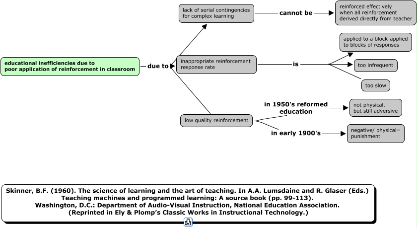 PastEdInefficiencies_Skinner_scienceLearningArtTeaching_1960, low quality reinforcement in 1950's reformed education not physical, but still adversive, educational inefficiencies due to poor application of reinforcement in classroom due to inappropriate reinforcement response rate, low quality reinforcement in early 1900's negative/ physical= punishment, lack of serial contingencies for complex learning cannot be reinforced effectively when all reinforcement derived directly from teacher, inappropriate reinforcement response rate is too slow, inappropriate reinforcement response rate is applied to a block-applied to blocks of responses, inappropriate reinforcement response rate is too infrequent, educational inefficiencies due to poor application of reinforcement in classroom due to low quality reinforcement, educational inefficiencies due to poor application of reinforcement in classroom due to lack of serial contingencies for complex learning