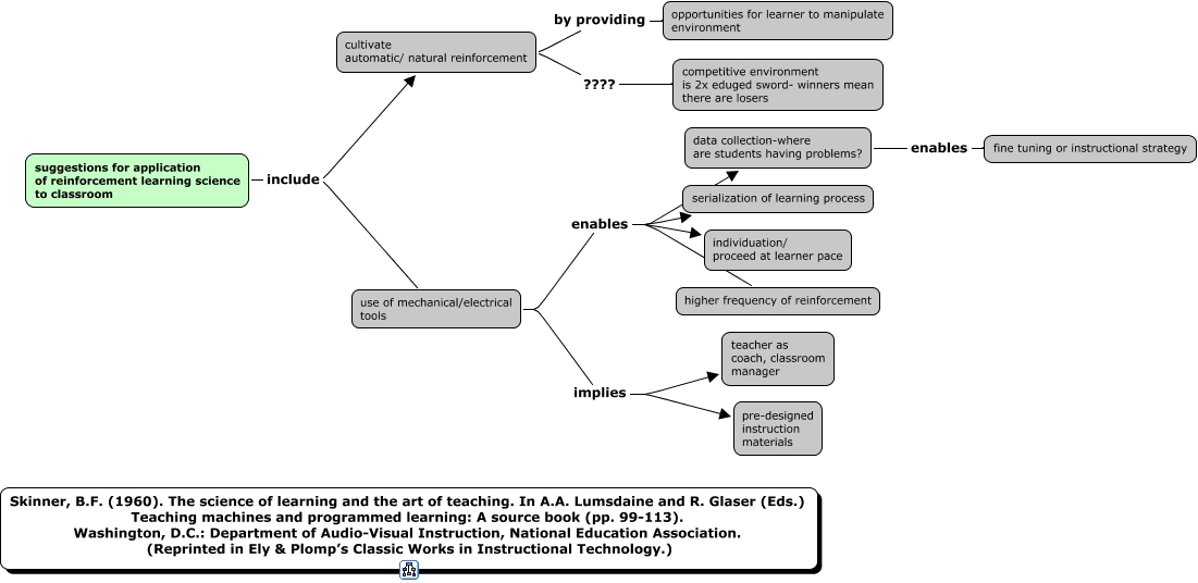 ApplicationSuggestions_Skinner_scienceLearningArtTeaching_1960, suggestions for application of reinforcement learning science to classroom include use of mechanical/electrical tools, use of mechanical/electrical tools enables higher frequency of reinforcement, use of mechanical/electrical tools enables individuation/ proceed at learner pace, use of mechanical/electrical tools enables serialization of learning process, use of mechanical/electrical tools implies teacher as coach, classroom manager, use of mechanical/electrical tools implies pre-designed instruction materials, cultivate automatic/ natural reinforcement ???? competitive environment is 2x eduged sword- winners mean there are losers, cultivate automatic/ natural reinforcement by providing opportunities for learner to manipulate environment, suggestions for application of reinforcement learning science to classroom include cultivate automatic/ natural reinforcement, data collection-where are students having problems? enables fine tuning or instructional strategy
