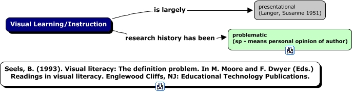 VisualLearningandInstruction_seels_visualLiteracy_1993, Visual Learning/Instruction research history has been problematic (sp - means personal opinion of author), Visual Learning/Instruction is largely presentational (Langer, Susanne 1951)