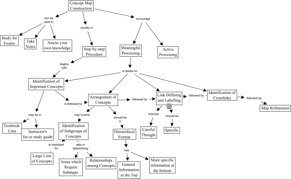 Este Cmap, tiene información relacionada con: Concept Map Construction, Meaningful Processing is based on Identification of Crosslinks, Link Defining and Labelling requires Careful Thought, Concept Map Construction can be used to Assess your own knowledge, Identification of Subgroups of Concepts is important for Large Lists of Concepts, Meaningful Processing is based on Link Defining and Labelling, Concept Map Construction can be used to Take Notes, Arrangement of Concepts followed by Link Defining and Labelling, Concept Map Construction can be used to Study for Exams, Hierarchical Format has General Information at the Top, Link Defining and Labelling should be Specific, Concept Map Construction usually in Step-by-step Procedure, Meaningful Processing is based on Identification of Important Concepts, Concept Map Construction encourage Active Processing, Arrangement of Concepts may involve Identification of Subgroups of Concepts, Identification of Crosslinks followed by Map Refinement, Concept Map Construction encourage Meaningful Processing, Arrangement of Concepts should be in Hierarchical Format, Link Defining and Labelling followed by Identification of Crosslinks, Meaningful Processing is based on Arrangement of Concepts, Identification of Subgroups of Concepts aids in determining Relationships among Concepts