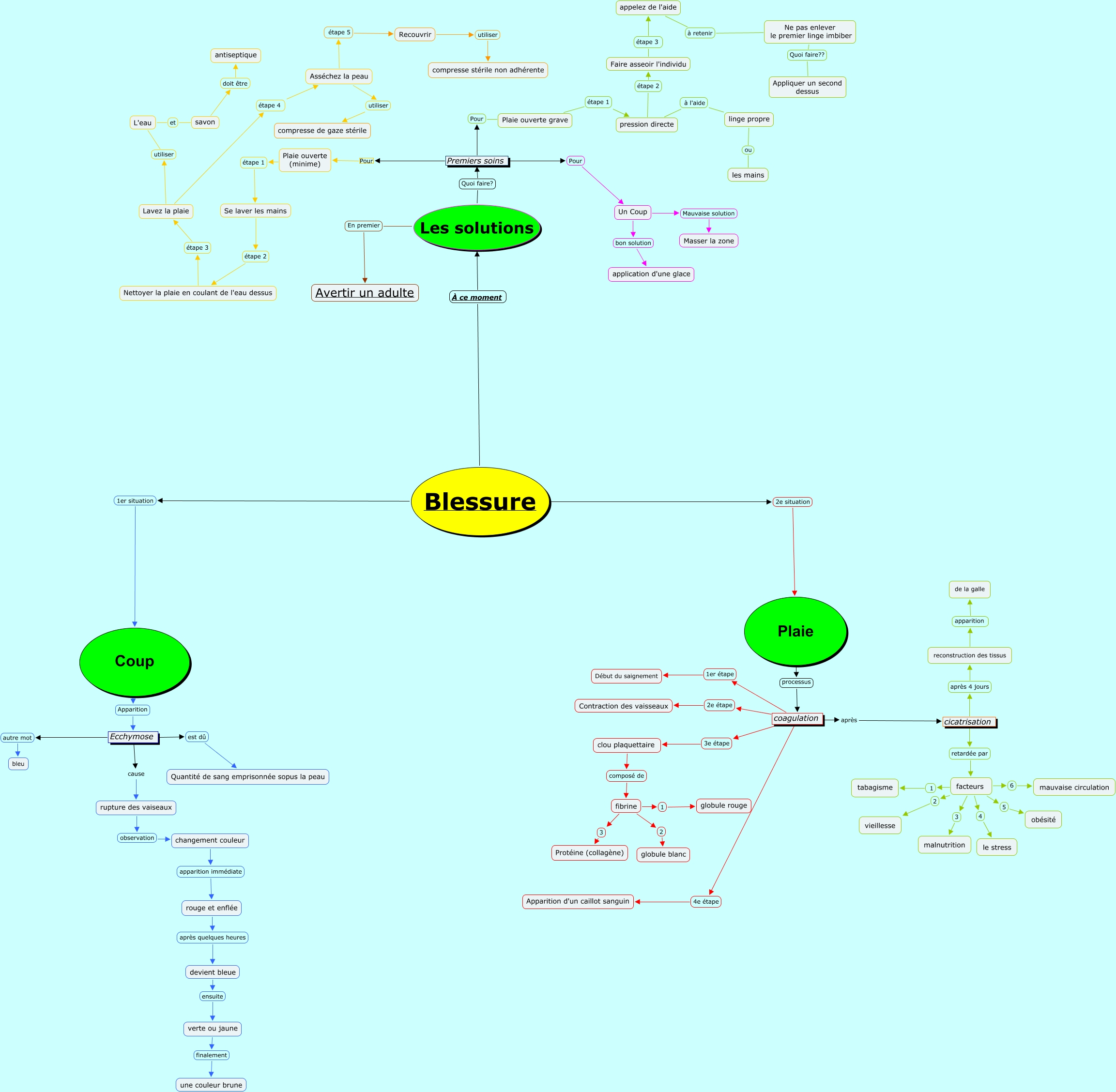 This Concept Map, created with IHMC CmapTools, has information related to: AH...La blessure, Ecchymose cause rupture des vaiseaux, Les solutions En premier Avertir un adulte, appelez de l'aide à retenir Ne pas enlever le premier linge imbiber, Ne pas enlever le premier linge imbiber Quoi faire?? Appliquer un second dessus, facteurs 4 le stress, facteurs 6 mauvaise circulation, Asséchez la peau étape 5 Recouvrir, fibrine 1 globule rouge, cicatrisation après 4 jours reconstruction des tissus, cicatrisation retardée par facteurs, pression directe à l'aide linge propre, devient bleue ensuite verte ou jaune, Premiers soins Pour Plaie ouverte grave, Les solutions Quoi faire? Premiers soins, Coup Apparition Ecchymose, linge propre ou les mains, Recouvrir utiliser compresse stérile non adhérente, coagulation 3e étape clou plaquettaire, Lavez la plaie utiliser L'eau, coagulation après cicatrisation