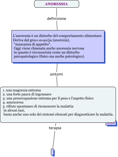Questa Cmap, creata con IHMC CmapTools, contiene informazioni relative a: delia cadoni e giulia anzani, 1. una magrezza estrema 2. una forte paura di ingrassare 3. una preoccupazione estrema per il peso e l'aspetto fisico 4. amenorrea 5. rifiuto spontaneo di riconoscere la malattia in alcuni casi, basta anche uno solo dei sintomi elencati per diagnosticare la malattia. terapia, L'anoressia è un disturbo del comportamento alimentare. Deriva dal greco ανορεξία (anorexia), “mancanza di appetito”. Oggi viene chiamata anche anoressia nervosa in quanto è riconosciuta come un disturbo psicopatologico (fisico ma anche psicologico). sintomi 1. una magrezza estrema 2. una forte paura di ingrassare 3. una preoccupazione estrema per il peso e l'aspetto fisico 4. amenorrea 5. rifiuto spontaneo di riconoscere la malattia in alcuni casi, basta anche uno solo dei sintomi elencati per diagnosticare la malattia., ANORESSIA definizione L'anoressia è un disturbo del comportamento alimentare. Deriva dal greco ανορεξία (anorexia), “mancanza di appetito”. Oggi viene chiamata anche anoressia nervosa in quanto è riconosciuta come un disturbo psicopatologico (fisico ma anche psicologico).