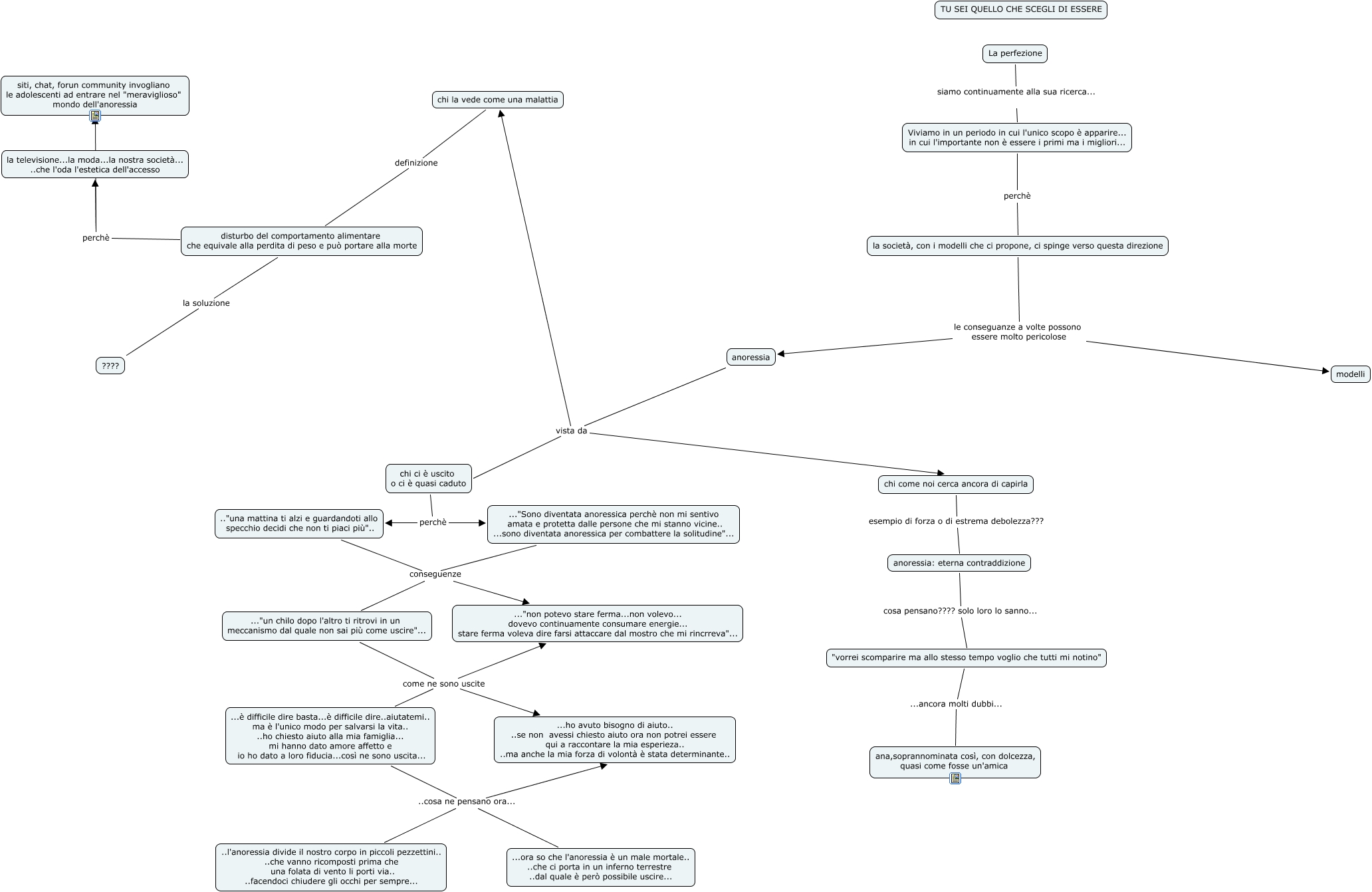 Questa Cmap, creata con IHMC CmapTools, contiene informazioni relative a: tu sei quello che scegli di essere, Viviamo in un periodo in cui l'unico scopo è apparire... in cui l'importante non è essere i primi ma i migliori... perchè la società, con i modelli che ci propone, ci spinge verso questa direzione, chi come noi cerca ancora di capirla esempio di forza o di estrema debolezza??? anoressia: eterna contraddizione, "vorrei scomparire ma allo stesso tempo voglio che tutti mi notino" ...ancora molti dubbi... ana,soprannominata così, con dolcezza, quasi come fosse un'amica, .."una mattina ti alzi e guardandoti allo specchio decidi che non ti piaci più".. conseguenze ..."un chilo dopo l'altro ti ritrovi in un meccanismo dal quale non sai più come uscire"..., chi la vede come una malattia definizione disturbo del comportamento alimentare che equivale alla perdita di peso e può portare alla morte, ...è difficile dire basta...è difficile dire..aiutatemi.. ma è l'unico modo per salvarsi la vita.. ..ho chiesto aiuto alla mia famiglia... mi hanno dato amore affetto e io ho dato a loro fiducia...così ne sono uscita... ..cosa ne pensano ora... ...ho avuto bisogno di aiuto.. ..se non avessi chiesto aiuto ora non potrei essere qui a raccontare la mia esperieza.. ..ma anche la mia forza di volontà è stata determinante.., la società, con i modelli che ci propone, ci spinge verso questa direzione le conseguanze a volte possono essere molto pericolose modelli, chi ci è uscito o ci è quasi caduto perchè ..."Sono diventata anoressica perchè non mi sentivo amata e protetta dalle persone che mi stanno vicine.. ...sono diventata anoressica per combattere la solitudine"..., ..."Sono diventata anoressica perchè non mi sentivo amata e protetta dalle persone che mi stanno vicine.. ...sono diventata anoressica per combattere la solitudine"... conseguenze ..."non potevo stare ferma...non volevo... dovevo continuamente consumare energie... stare ferma voleva dire farsi attaccare dal mostro che mi rincrreva"..., disturbo del comportamento alimentare che equivale alla perdita di peso e può portare alla morte la soluzione ????, .."una mattina ti alzi e guardandoti allo specchio decidi che non ti piaci più".. conseguenze ..."non potevo stare ferma...non volevo... dovevo continuamente consumare energie... stare ferma voleva dire farsi attaccare dal mostro che mi rincrreva"..., anoressia: eterna contraddizione cosa pensano???? solo loro lo sanno... "vorrei scomparire ma allo stesso tempo voglio che tutti mi notino", anoressia vista da chi ci è uscito o ci è quasi caduto, la società, con i modelli che ci propone, ci spinge verso questa direzione le conseguanze a volte possono essere molto pericolose anoressia, ..."un chilo dopo l'altro ti ritrovi in un meccanismo dal quale non sai più come uscire"... come ne sono uscite ..."non potevo stare ferma...non volevo... dovevo continuamente consumare energie... stare ferma voleva dire farsi attaccare dal mostro che mi rincrreva"..., disturbo del comportamento alimentare che equivale alla perdita di peso e può portare alla morte perchè siti, chat, forun community invogliano le adolescenti ad entrare nel "meraviglioso" mondo dell'anoressia, ..."Sono diventata anoressica perchè non mi sentivo amata e protetta dalle persone che mi stanno vicine.. ...sono diventata anoressica per combattere la solitudine"... conseguenze ..."un chilo dopo l'altro ti ritrovi in un meccanismo dal quale non sai più come uscire"..., ...è difficile dire basta...è difficile dire..aiutatemi.. ma è l'unico modo per salvarsi la vita.. ..ho chiesto aiuto alla mia famiglia... mi hanno dato amore affetto e io ho dato a loro fiducia...così ne sono uscita... ..cosa ne pensano ora... ..l'anoressia divide il nostro corpo in piccoli pezzettini.. ..che vanno ricomposti prima che una folata di vento li porti via.. ..facendoci chiudere gli occhi per sempre..., La perfezione siamo continuamente alla sua ricerca... Viviamo in un periodo in cui l'unico scopo è apparire... in cui l'importante non è essere i primi ma i migliori..., ..."un chilo dopo l'altro ti ritrovi in un meccanismo dal quale non sai più come uscire"... come ne sono uscite ...è difficile dire basta...è difficile dire..aiutatemi.. ma è l'unico modo per salvarsi la vita.. ..ho chiesto aiuto alla mia famiglia... mi hanno dato amore affetto e io ho dato a loro fiducia...così ne sono uscita...