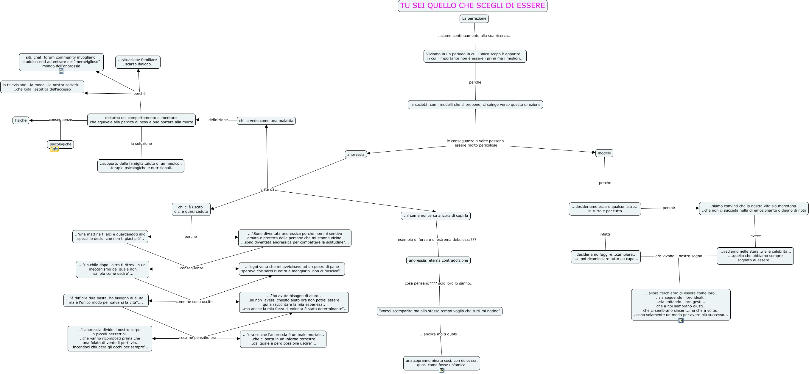Questa Cmap, creata con IHMC CmapTools, contiene informazioni relative a: lavoro gruppo 6, modelli perchè ...desideriamo essere qualcun'altro... ...in tutto e per tutto..., Viviamo in un periodo in cui l'unico scopo è apparire... in cui l'importante non è essere i primi ma i migliori... perchè la società, con i modelli che ci propone, ci spinge verso questa direzione, chi come noi cerca ancora di capirla esempio di forza o di estrema debolezza??? anoressia: eterna contraddizione, ..."Sono diventata anoressica perchè non mi sentivo amata e protetta dalle persone che mi stanno vicine.. ...sono diventata anoressica per combattere la solitudine"... conseguenze ..."un chilo dopo l'altro ti ritrovi in un meccanismo dal quale non sai più come uscire"..., disturbo del comportamento alimentare che equivale alla perdita di peso e può portare alla morte conseguenze fisiche, disturbo del comportamento alimentare che equivale alla perdita di peso e può portare alla morte perchè ...situazione familiare ..scarso dialogo.., ...vediamo nelle stars...nelle celebrità... ....quello che abbiamo sempre sognato di essere... loro vivono il nostro sogno ...allora cerchiamo di essere come loro.. ..sia seguendo i loro ideali.. ..sia imitando i loro gesti... che a noi sembrano giusti.. che ci sembrano sinceri...ma che a volte.. ..sono solamente un modo per avere più successo..., "vorrei scomparire ma allo stesso tempo voglio che tutti mi notino" ...ancora molti dubbi... ana,soprannominata così, con dolcezza, quasi come fosse un'amica, .."una mattina ti alzi e guardandoti allo specchio decidi che non ti piaci più".. conseguenze ..."un chilo dopo l'altro ti ritrovi in un meccanismo dal quale non sai più come uscire"..., chi la vede come una malattia definizione disturbo del comportamento alimentare che equivale alla perdita di peso e può portare alla morte, ..."è difficile dire basta, ho bisogno di aiuto.. ma è l'unico modo per salvarsi la vita".... cosa ne pensano ora ..."ho avuto bisogno di aiuto.. ..se non avessi chiesto aiuto ora non potrei essere qui a raccontare la mia esperieza.. ..ma anche la mia forza di volontà è stata determinante".., ...desideriamo essere qualcun'altro... ...in tutto e per tutto... infatti desideriamo fuggire...cambiare.. ...e poi ricominciare tutto da capo..., la società, con i modelli che ci propone, ci spinge verso questa direzione le conseguanze a volte possono essere molto pericolose modelli, chi ci è uscito o ci è quasi caduto perchè ..."Sono diventata anoressica perchè non mi sentivo amata e protetta dalle persone che mi stanno vicine.. ...sono diventata anoressica per combattere la solitudine"..., ...desideriamo essere qualcun'altro... ...in tutto e per tutto... perchè ...siamo convinti che la nostra vita sia monotona... ..che non ci succeda nulla di emozionante o degno di nota, disturbo del comportamento alimentare che equivale alla perdita di peso e può portare alla morte la soluzione ..supporto della famiglia..aiuto di un medico.. ..terapie psicologiche e nutrizionali.., desideriamo fuggire...cambiare.. ...e poi ricominciare tutto da capo... loro vivono il nostro sogno ...allora cerchiamo di essere come loro.. ..sia seguendo i loro ideali.. ..sia imitando i loro gesti... che a noi sembrano giusti.. che ci sembrano sinceri...ma che a volte.. ..sono solamente un modo per avere più successo..., .."una mattina ti alzi e guardandoti allo specchio decidi che non ti piaci più".. conseguenze ..."ogni volta che mi avvicinavo ad un pezzo di pane speravo che sarei riuscita a mangiarlo..non ci riuscivo".., anoressia: eterna contraddizione cosa pensano???? solo loro lo sanno... "vorrei scomparire ma allo stesso tempo voglio che tutti mi notino", anoressia vista da chi ci è uscito o ci è quasi caduto
