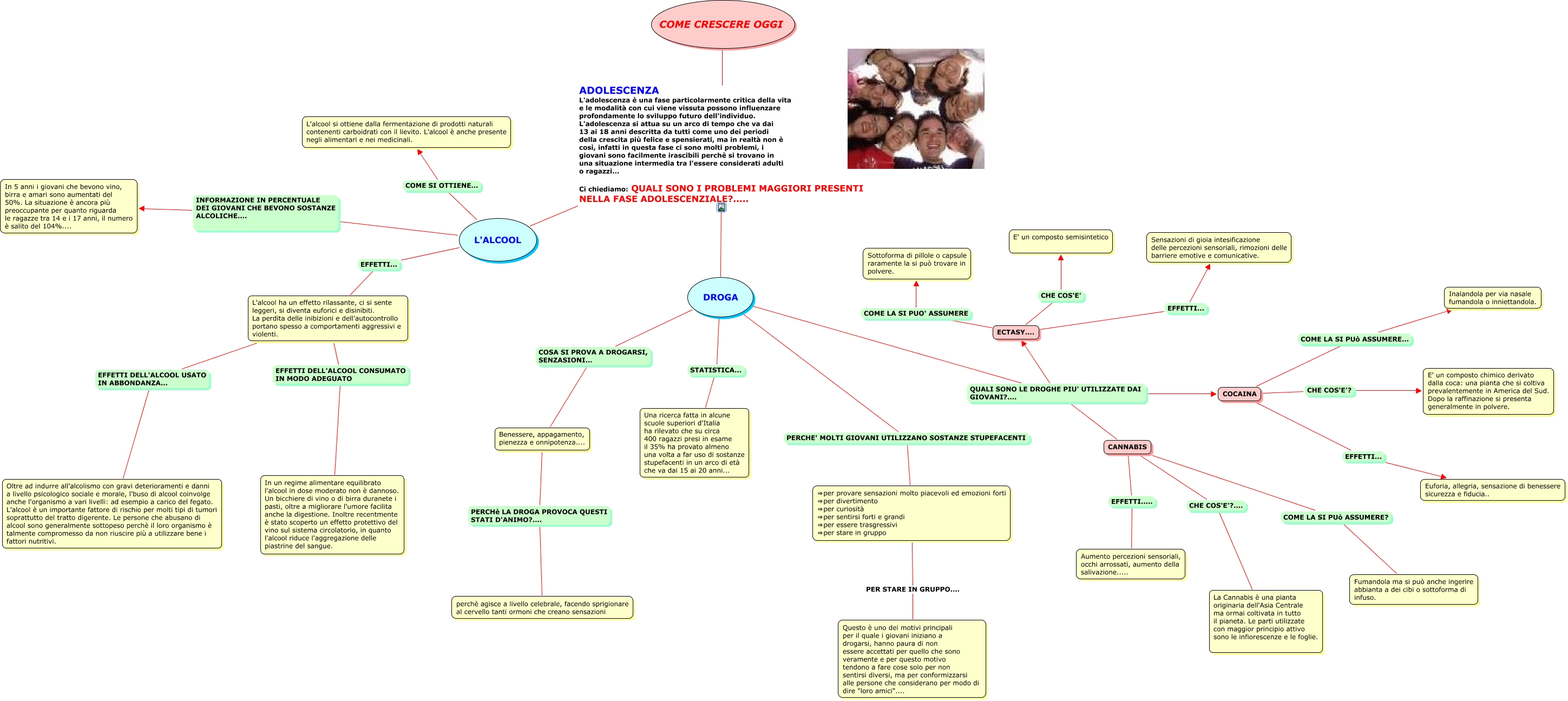 Questa Cmap, creata con IHMC CmapTools, contiene informazioni relative a: gruppo3, DROGA QUALI SONO LE DROGHE PIU' UTILIZZATE DAI GIOVANI?.... ECTASY...., Benessere, appagamento, pienezza e onnipotenza.... PERCHè LA DROGA PROVOCA QUESTI STATI D'ANIMO?.... perchè agisce a livello celebrale, facendo sprigionare al cervello tanti ormoni che creano sensazioni, ⇒per provare sensazioni molto piacevoli ed emozioni forti ⇒per divertimento ⇒per curiosità ⇒per sentirsi forti e grandi ⇒per essere trasgressivi ⇒per stare in gruppo PER STARE IN GRUPPO.... Questo è uno dei motivi principali per il quale i giovani iniziano a drogarsi, hanno paura di non essere accettati per quello che sono veramente e per questo motivo tendono a fare cose solo per non sentirsi diversi, ma per conformizzarsi alle persone che considerano per modo di dire "loro amici"...., L'ALCOOL INFORMAZIONE IN PERCENTUALE DEI GIOVANI CHE BEVONO SOSTANZE ALCOLICHE.... In 5 anni i giovani che bevono vino, birra e amari sono aumentati del 50%. La situazione è ancora più preoccupante per quanto riguarda le ragazze tra 14 e i 17 anni, il numero è salito del 104%...., L'ALCOOL EFFETTI... L'alcool ha un effetto rilassante, ci si sente leggeri, si diventa euforici e disinibiti. La perdita delle inibizioni e dell'autocontrollo portano spesso a comportamenti aggressivi e violenti., DROGA COSA SI PROVA A DROGARSI, SENZASIONI... Benessere, appagamento, pienezza e onnipotenza...., L'alcool ha un effetto rilassante, ci si sente leggeri, si diventa euforici e disinibiti. La perdita delle inibizioni e dell'autocontrollo portano spesso a comportamenti aggressivi e violenti. EFFETTI DELL'ALCOOL CONSUMATO IN MODO ADEGUATO In un regime alimentare equilibrato l'alcool in dose moderato non è dannoso. Un bicchiere di vino o di birra duranete i pasti, oltre a migliorare l'umore facilita anche la digestione. Inoltre recentmente è stato scoperto un effetto protettivo del vino sul sistema circolatorio, in quanto l'alcool riduce l'aggregazione delle piastrine del sangue., ECTASY.... CHE COS'E' E' un composto semisintetico, DROGA STATISTICA... Una ricerca fatta in alcune scuole superiori d'Italia ha rilevato che su circa 400 ragazzi presi in esame il 35% ha provato almeno una volta a far uso di sostanze stupefacenti in un arco di età che va dai 15 ai 20 anni..., CANNABIS CHE COS'E'?.... La Cannabis è una pianta originaria dell'Asia Centrale ma ormai coltivata in tutto il pianeta. Le parti utilizzate con maggior principio attivo sono le infiorescenze e le foglie., COME CRESCERE OGGI ADOLESCENZA L'adolescenza è una fase particolarmente critica della vita e le modalità con cui viene vissuta possono influenzare profondamente lo sviluppo futuro dell'individuo. L'adolescenza si attua su un arco di tempo che va dai 13 ai 18 anni descritta da tutti come uno dei periodi della crescita più felice e spensierati, ma in realtà non è così, infatti in questa fase ci sono molti problemi, i giovani sono facilmente irascibili perchè si trovano in una situazione intermedia tra l'essere considerati adulti o ragazzi... Ci chiediamo: QUALI SONO I PROBLEMI MAGGIORI PRESENTI NELLA FASE ADOLESCENZIALE?..... L'ALCOOL, ECTASY.... COME LA SI PUO' ASSUMERE Sottoforma di pillole o capsule raramente la si può trovare in polvere., DROGA QUALI SONO LE DROGHE PIU' UTILIZZATE DAI GIOVANI?.... CANNABIS, COCAINA EFFETTI... Euforia, allegria, sensazione di benessere sicurezza e fiducia.., COCAINA CHE COS'E'? E' un composto chimico derivato dalla coca: una pianta che si coltiva prevalentemente in America del Sud. Dopo la raffinazione si presenta generalmente in polvere., DROGA PERCHE' MOLTI GIOVANI UTILIZZANO SOSTANZE STUPEFACENTI ⇒per provare sensazioni molto piacevoli ed emozioni forti ⇒per divertimento ⇒per curiosità ⇒per sentirsi forti e grandi ⇒per essere trasgressivi ⇒per stare in gruppo, CANNABIS COME LA SI PUò ASSUMERE? Fumandola ma si può anche ingerire abbianta a dei cibi o sottoforma di infuso., COME CRESCERE OGGI ADOLESCENZA L'adolescenza è una fase particolarmente critica della vita e le modalità con cui viene vissuta possono influenzare profondamente lo sviluppo futuro dell'individuo. L'adolescenza si attua su un arco di tempo che va dai 13 ai 18 anni descritta da tutti come uno dei periodi della crescita più felice e spensierati, ma in realtà non è così, infatti in questa fase ci sono molti problemi, i giovani sono facilmente irascibili perchè si trovano in una situazione intermedia tra l'essere considerati adulti o ragazzi... Ci chiediamo: QUALI SONO I PROBLEMI MAGGIORI PRESENTI NELLA FASE ADOLESCENZIALE?..... DROGA, L'ALCOOL COME SI OTTIENE... L'alcool si ottiene dalla fermentazione di prodotti naturali contenenti carboidrati con il lievito. L'alcool è anche presente negli alimentari e nei medicinali., CANNABIS EFFETTI..... Aumento percezioni sensoriali, occhi arrossati, aumento della salivazione.....