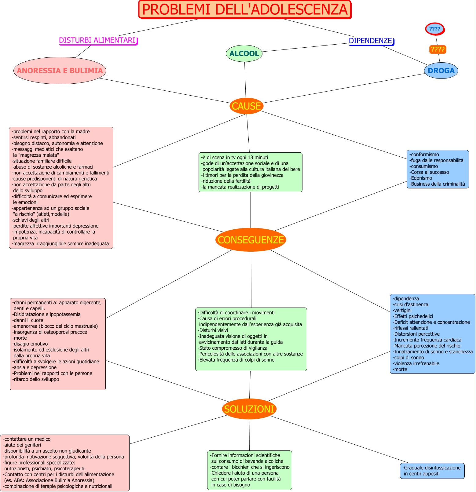 Questa Cmap, creata con IHMC CmapTools, contiene informazioni relative a: GRUPPO4, -Difficoltà di coordinare i movimenti -Causa di errori procedurali indipendentemente dall’esperienza già acquisita -Disturbi visivi -Inadeguata visione di oggetti in avvicinamento dai lati durante la guida -Stato compromesso di vigilanza -Pericolosità delle associazioni con altre sostanze -Elevata frequenza di colpi di sonno SOLUZIONI -Fornire informazioni scientifiche sul consumo di bevande alcoliche -contare i bicchieri che si ingeriscono -Chiedere l’aiuto di una persona con cui poter parlare con facilità in caso di bisogno, -danni permanenti a: apparato digerente, denti e capelli. -Disidratazione e ipopotassemia -danni il cuore -amenorrea (blocco del ciclo mestruale) -insorgenza di osteoporosi precoce -morte -disagio emotivo -isolamento ed esclusione degli altri dalla propria vita -difficoltà a svolgere le azioni quotidiane -ansia e depressione -Problemi nei rapporti con le persone -ritardo dello sviluppo SOLUZIONI -Fornire informazioni scientifiche sul consumo di bevande alcoliche -contare i bicchieri che si ingeriscono -Chiedere l’aiuto di una persona con cui poter parlare con facilità in caso di bisogno, -conformismo -fuga dalle responsabilità -consumismo -Corsa al successo -Edonismo -Business della criminalità CONSEGUENZE -danni permanenti a: apparato digerente, denti e capelli. -Disidratazione e ipopotassemia -danni il cuore -amenorrea (blocco del ciclo mestruale) -insorgenza di osteoporosi precoce -morte -disagio emotivo -isolamento ed esclusione degli altri dalla propria vita -difficoltà a svolgere le azioni quotidiane -ansia e depressione -Problemi nei rapporti con le persone -ritardo dello sviluppo, -dipendenza -crisi d'astinenza -vertigini -Effetti psichedelici -Deficit attenzione e concentrazione -riflessi rallentati -Distorsioni percettive -Incremento frequenza cardiaca -Mancata percezione del rischio -Innalzamento di sonno e stanchezza -colpi di sonno -violenza irrefrenabile -morte SOLUZIONI -contattare un medico -aiuto dei genitori -disponibilità a un ascolto non giudicante -profonda motivazione soggettiva, volontà della persona -figure professionali specializzate: nutrizionisti, psichiatri, psicoterapeuti -Contatto con centri per i disturbi dell'alimentazione (es. ABA: Associazione Bulimia Anoressia) -combinazione di terapie psicologiche e nutrizionali, -è di scena in tv ogni 13 minuti -gode di un’accettazione sociale e di una popolarità legate alla cultura italiana del bere -i timori per la perdita della giovinezza -riduzione della fertilità -la mancata realizzazione di progetti CONSEGUENZE -Difficoltà di coordinare i movimenti -Causa di errori procedurali indipendentemente dall’esperienza già acquisita -Disturbi visivi -Inadeguata visione di oggetti in avvicinamento dai lati durante la guida -Stato compromesso di vigilanza -Pericolosità delle associazioni con altre sostanze -Elevata frequenza di colpi di sonno, -problemi nel rapporto con la madre -sentirsi respinti, abbandonati -bisogno distacco, autonomia e attenzione -messaggi mediatici che esaltano la "magrezza malata" -situazione familiare difficile -abuso di sostanze alcoliche e farmaci -non accettazione di cambiamenti e fallimenti -cause predisponenti di natura genetica -non accettazione da parte degli altri dello sviluppo -difficoltà a comunicare ed esprimere le emozioni -appartenenza ad un gruppo sociale "a rischio" (atleti,modelle) -schiavi degli altri -perdite affettive importanti depressione -impotenza, incapacità di controllare la propria vita -magrezza irraggiungibile sempre inadeguata CONSEGUENZE -dipendenza -crisi d'astinenza -vertigini -Effetti psichedelici -Deficit attenzione e concentrazione -riflessi rallentati -Distorsioni percettive -Incremento frequenza cardiaca -Mancata percezione del rischio -Innalzamento di sonno e stanchezza -colpi di sonno -violenza irrefrenabile -morte, DROGA CAUSE -conformismo -fuga dalle responsabilità -consumismo -Corsa al successo -Edonismo -Business della criminalità, ANORESSIA E BULIMIA CAUSE -conformismo -fuga dalle responsabilità -consumismo -Corsa al successo -Edonismo -Business della criminalità, -Difficoltà di coordinare i movimenti -Causa di errori procedurali indipendentemente dall’esperienza già acquisita -Disturbi visivi -Inadeguata visione di oggetti in avvicinamento dai lati durante la guida -Stato compromesso di vigilanza -Pericolosità delle associazioni con altre sostanze -Elevata frequenza di colpi di sonno SOLUZIONI -Graduale disintossicazione in centri appositi, PROBLEMI DELL'ADOLESCENZA DIPENDENZE DROGA, -conformismo -fuga dalle responsabilità -consumismo -Corsa al successo -Edonismo -Business della criminalità CONSEGUENZE -dipendenza -crisi d'astinenza -vertigini -Effetti psichedelici -Deficit attenzione e concentrazione -riflessi rallentati -Distorsioni percettive -Incremento frequenza cardiaca -Mancata percezione del rischio -Innalzamento di sonno e stanchezza -colpi di sonno -violenza irrefrenabile -morte, -conformismo -fuga dalle responsabilità -consumismo -Corsa al successo -Edonismo -Business della criminalità CONSEGUENZE -Difficoltà di coordinare i movimenti -Causa di errori procedurali indipendentemente dall’esperienza già acquisita -Disturbi visivi -Inadeguata visione di oggetti in avvicinamento dai lati durante la guida -Stato compromesso di vigilanza -Pericolosità delle associazioni con altre sostanze -Elevata frequenza di colpi di sonno, -danni permanenti a: apparato digerente, denti e capelli. -Disidratazione e ipopotassemia -danni il cuore -amenorrea (blocco del ciclo mestruale) -insorgenza di osteoporosi precoce -morte -disagio emotivo -isolamento ed esclusione degli altri dalla propria vita -difficoltà a svolgere le azioni quotidiane -ansia e depressione -Problemi nei rapporti con le persone -ritardo dello sviluppo SOLUZIONI -Graduale disintossicazione in centri appositi, DROGA ???? ????, -problemi nel rap