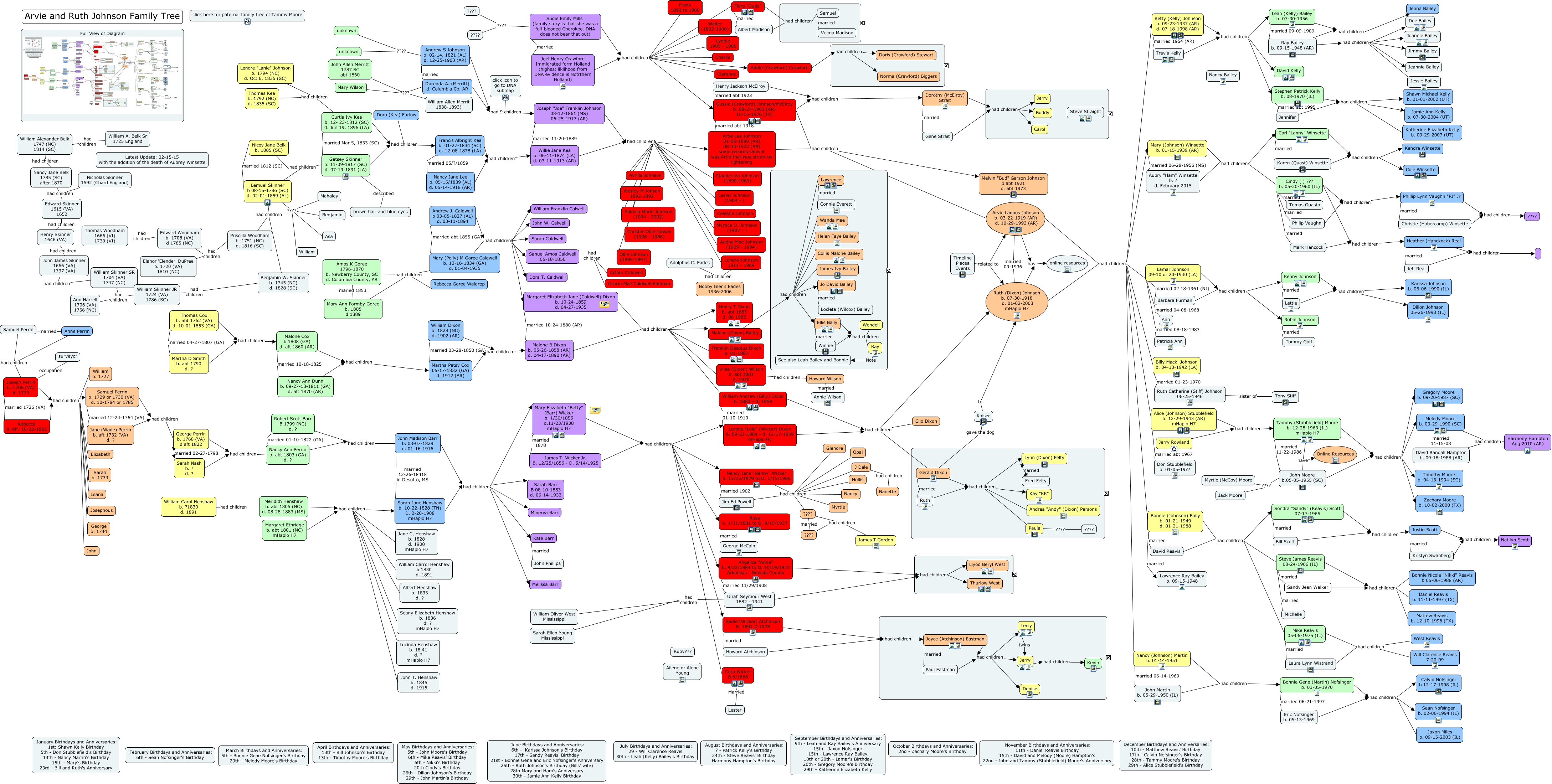 This Concept Map, created with IHMC CmapTools, has information related to: Johnson Family Tree, Gerald Dixon had children Kay "KK", Curtis Ivy Kea b. 12- 23-1812 (SC) d. Jun 19, 1896 (LA) had children Francis Albright Kea b. 01-27-1834 (SC) d. 12-08-1878 (LA), Lamar Johnson 09-10 or 20-1940 (LA) had children Robin Johnson, Lawrence married Connie Everett, Joseph Perrin b. 1706 (VA) d. 1773 had children Leana, Nancy Ann Dunn b. 09-27-18-1811 (GA) d. aft 1870 (AR) had children Martha Patsy Cox 05-17-1832 (GA) d. 1912 (AR), Cindy ( ) ??? b. 05-20-1960 (IL) married Mark Hancock, Tammy (Stubblefield) Moore b. 12-28-1963 (IL) mHaplo H7 had children Timothy Moore b. 04-13-1994 (SC), Malone Cox b 1808 (GA) d. aft 1860 (AR) married 10-18-1825 Nancy Ann Dunn b. 09-27-18-1811 (GA) d. aft 1870 (AR), Lamar Johnson 09-10 or 20-1940 (LA) had children Kenny Johnson, Willie Jane Kea b. 06-11-1874 (LA) d. 03-11-1913 (AR) had children Chester Obie Johson (1906 - 1986), Malone B Dixon b. 05-26-1858 (AR) d. 04-17-1890 (AR) had children Henry T Dixon b. abt 1885 d. 06 1965, Howard Atchinson had children Joyce (Atchinson) Eastman, Arvie Lanous Johnson b. 03-22-1919 (AR) d. 10-29-1993 (AR) had children Billy Mack Johnson b. 04-13-1942 (LA), Paul Eastman had children Jerry, Bonnie Gene (Martin) Nofsinger b. 03-05-1970 had children Calvin Nofsinger b 12-17-1998 (IL), Dorothy (McElroy) Strait had children Jerry, Joel Henry Crawford Immigrated form Holland (highest liklihood from DNA evidence is Notrthern Holland) had children Charlie, Samuel Perrin had children Joseph Perrin b. 1706 (VA) d. 1773, Joseph Perrin b. 1706 (VA) d. 1773 had children Elizabeth
