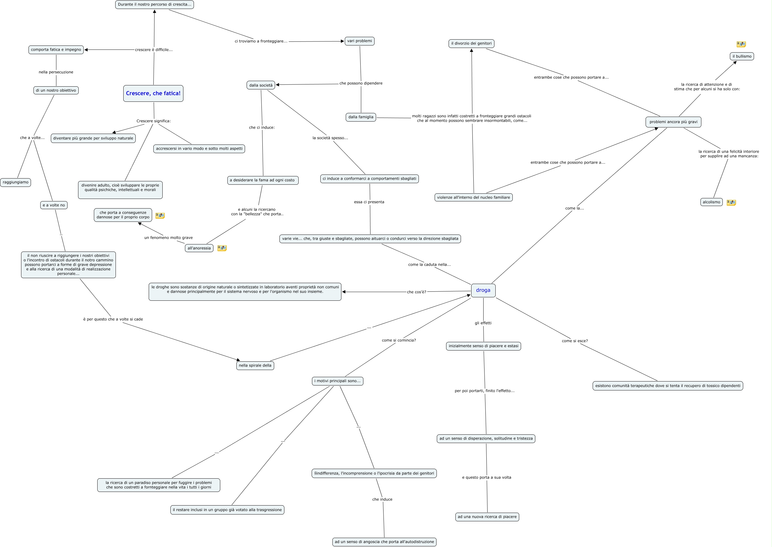Lavoro gruppo 7 definitivo, droga come si esce? esistono comunità terapeutiche dove si tenta il recupero di tossico dipendenti, problemi ancora più gravi la ricerca di attenzione e di stima che per alcuni si ha solo con: il bullismo, ci induce a conformarci a comportamenti sbagliati essa ci presenta varie vie... che, tra giuste e sbagliate, possono aituarci o condurci verso la direzione sbagliata, inizialmente senso di piacere e estasi per poi portarti, finito l'effetto... ad un senso di disperazione, solitudine e tristezza, problemi ancora più gravi come la... droga, i motivi principali sono... ... il restare inclusi in un gruppo già votato alla trasgressione, dalla famiglia molti ragazzi sono infatti costretti a fronteggiare grandi ostacoli che al momento possono sembrare insormontabili, come... il divorzio dei genitori, Crescere, che fatica! Crescere significa: divenire adulto, cioè sviluppare le proprie qualità psichiche, intellettuali e morali, dalla famiglia molti ragazzi sono infatti costretti a fronteggiare grandi ostacoli che al momento possono sembrare insormontabili, come... violenze all'interno del nucleo familiare, il non riuscire a riggiungere i nostri obiettivi o l'incontro di ostacoli durante il notro cammino possono portarci a forme di grave depressione e alla ricerca di una modalità di realizzazione personale... è per questo che a volte si cade nella spirale della