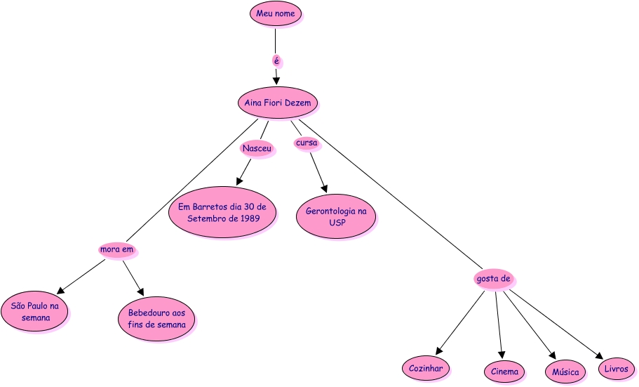 Este Mapa Conceitual tem informações relacionadas a: Atividade 1, Aina Fiori Dezem mora em Bebedouro aos fins de semana, Aina Fiori Dezem cursa Gerontologia na USP, Aina Fiori Dezem gosta de Livros, Aina Fiori Dezem gosta de Cozinhar, Aina Fiori Dezem mora em São Paulo na semana, Aina Fiori Dezem Nasceu Em Barretos dia 30 de Setembro de 1989, Meu nome é Aina Fiori Dezem, Aina Fiori Dezem gosta de Cinema, Aina Fiori Dezem gosta de Música