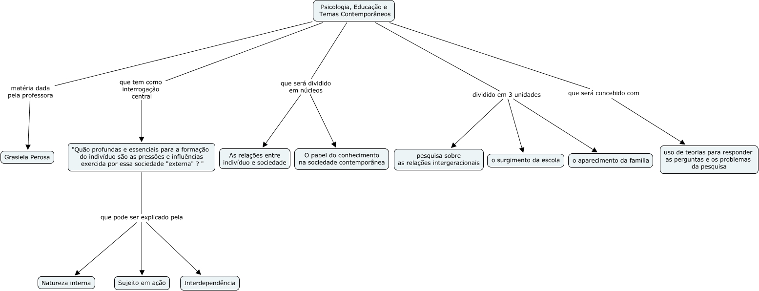 Este Mapa Conceitual tem informações relacionadas a: Atividade 2-v0, Psicologia, Educação e Temas Contemporâneos que tem como interrogação central "Quão profundas e essenciais para a formação do indivíduo são as pressões e influências exercida por essa sociedade "externa" ? ", Psicologia, Educação e Temas Contemporâneos que será concebido com uso de teorias para responder as perguntas e os problemas da pesquisa, Psicologia, Educação e Temas Contemporâneos que será dividido em núcleos As relações entre indivíduo e sociedade, Psicologia, Educação e Temas Contemporâneos que será dividido em núcleos O papel do conhecimento na sociedade contemporânea, "Quão profundas e essenciais para a formação do indivíduo são as pressões e influências exercida por essa sociedade "externa" ? " que pode ser explicado pela Sujeito em ação, Psicologia, Educação e Temas Contemporâneos dividido em 3 unidades o aparecimento da família, Psicologia, Educação e Temas Contemporâneos dividido em 3 unidades pesquisa sobre as relações intergeracionais, Psicologia, Educação e Temas Contemporâneos dividido em 3 unidades o surgimento da escola, Psicologia, Educação e Temas Contemporâneos matéria dada pela professora Grasiela Perosa, "Quão profundas e essenciais para a formação do indivíduo são as pressões e influências exercida por essa sociedade "externa" ? " que pode ser explicado pela Natureza interna