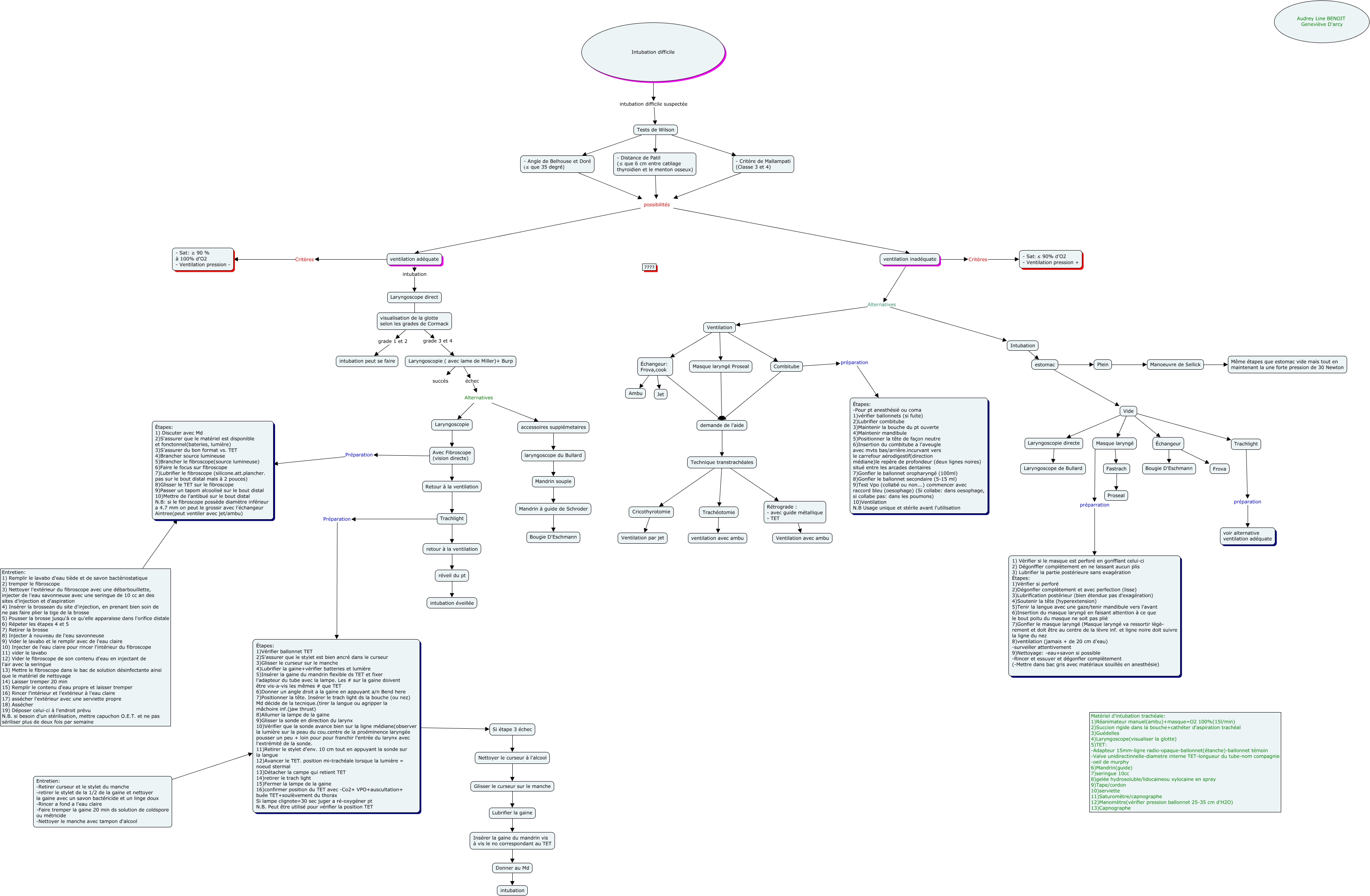 Cette carte de concepts créée avec IHMC CmapTools traite de: intubation_difficile, réveil du pt intubation éveillée, Technique transtrachéales Trachéotomie, Trachlight préparation voir alternative ventilation adéquate, Donner au Md intubation, Vide Trachlight, ventilation adéquate intubation Laryngoscope direct, ventilation inadéquate Alternatives Ventilation, Nettoyer le curseur à l'alcool Glisser le curseur sur le manche, Ventilation Échangeur: Frova,cook, Tests de Wilson - Critère de Mallampati (Classe 3 et 4), ventilation inadéquate Critères - Sat: ≤ 90% d'O2 - Ventilation pression +, Laryngoscopie ( avec lame de Miller)+ Burp échec Alternatives, Échangeur: Frova,cook Jet, Entretien: 1) Remplir le lavabo d'eau tiède et de savon bactériostatique 2) tremper le fibroscope 3) Nettoyer l'extérieur du fibroscope avec une débarbouillette, injecter de l'eau savonneuse avec une seringue de 10 cc an des sites d'injection et d'aspiration 4) Insérer la brossean du site d'injection, en prenant bien soin de ne pas faire plier la tige de la brosse 5) Pousser la brosse jusqu'à ce qu'elle apparaisse dans l'orifice distale 6) Répeter les étapes 4 et 5 7) Retirer la brosse 8) Injecter à nouveau de l'eau savonneuse 9) Vider le lavabo et le remplir avec de l'eau claire 10) Injecter de l'eau claire pour rincer l'intérieur du fibroscope 11) vider le lavabo 12) Vider le fibroscope de son contenu d'eau en injectant de l'air avec la seringue 13) Mettre le fibroscope dans le bac de solution désinfectante ainsi que le matériel de nettoyage 14) Laisser tremper 20 min 15) Remplir le contenu d'eau propre et laisser tremper 16) Rincer l'intérieur et l'extérieur à l'eau claire 17) assécher l'extérieur avec une serviette propre 18) Assécher 19) Déposer celui-ci à l'endroit prévu N.B. si besoin d'un stérilisation, mettre capuchon O.E.T. et ne pas sériliser plus de deux fois par semaine Étapes: 1) Discuter avec Md 2)S'assurer que le matériel est disponible et fonctonnel(bateries, lumière) 3)S'assurer du bon format vs. TET 4)Brancher source lumineuse 5)Brancher le fibroscope(source lumineuse) 6)Faire le focus sur fibroscope 7)Lubrifier le fibroscope (silicone.att.plancher. pas sur le bout distal mais à 2 pouces) 8)Glisser le TET sur le fibroscope 9)Passer un tapom alcoolisé sur le bout distal 10)Mettre de l'antibué sur le bout distal N.B: si le fibroscope possède diamètre inférieur a 4.7 mm on peut le grossir avec l'échangeur Aintree(peut ventiler avec jet/ambu), estomac Plein, Rétrograde : - avec guide métallique - TET Ventilation avec ambu, Intubation difficile intubation difficile suspectée Tests de Wilson, visualisation de la glotte selon les grades de Cormack grade 3 et 4 Laryngoscopie ( avec lame de Miller)+ Burp, ventilation adéquate Critères <math xmlns="http://www.w3.org/1998/Math/MathML"> <mrow> <mtext> - Sat: ≥ 90 %
