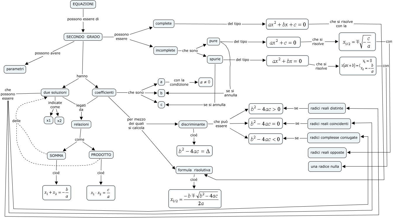 Questa Mappa Concettuale ha informazioni correlate a: equazioni di secondo grado, complete del tipo , a con la condizione , SECONDO GRADO possono essere complete, coefficienti per mezzo dei quali si calcola discriminante, coefficienti che sono c, coefficienti per mezzo dei quali si calcola formula risolutiva, con una radice nulla, SECONDO GRADO possono avere parametri, due soluzioni indicate come x2, che si risolve
