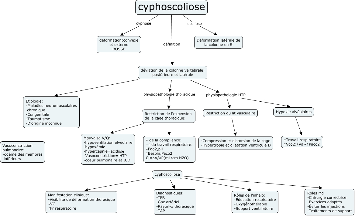 This Concept Map has information related to: cyphoscoliose, déviation de la colonne vertébrale: postérieure et latérale physiopathologie HTP Restriction du lit vasculaire, cyphoscoliose Manifestation clinique: -Visibilité de déformation thoracique ↓VC ↑Fr respiratoire, Restriction du lit vasculaire -Compression et distorsion de la cage -Hypertropie et dilatation ventricule D, déviation de la colonne vertébrale: postérieure et latérale physiopathologie HTP Hypoxie alvéolaires, Hypoxie alvéolaires ↑Travail respiratoire ↑Vco2:↓Va→↑Paco2, déviation de la colonne vertébrale: postérieure et latérale physiopathologie thoracique Restriction de l'expension de la cage thoracique:, cyphoscoliose Rôles de l'inhalo: -Éducation respiratoire -Oxygénothérapie -Support ventillatoire, cyphoscoliose Diagnostiques: -TFR -Gaz artériel -Rayon-x thoracique -TAP, cyphoscoliose cyphose déformation:convexe et externe BOSSE, déviation de la colonne vertébrale: postérieure et latérale Étiologie: -Maladies neuromusculaires chronique -Congénitale -Taumatisme -D'origine inconnue