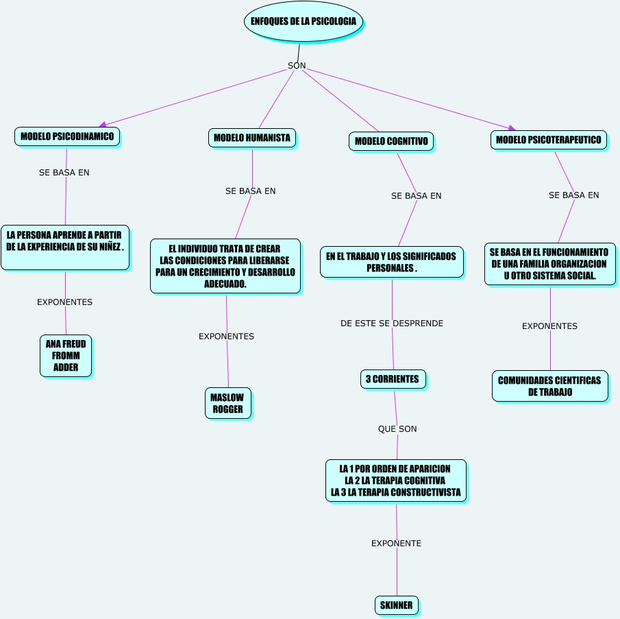 Este Cmap, tiene información relacionada con: ENFOQUES DE LA PSICOLOGIA, ENFOQUES DE LA PSICOLOGIA SON MODELO COGNITIVO, MODELO PSICOTERAPEUTICO SE BASA EN SE BASA EN EL FUNCIONAMIENTO DE UNA FAMILIA ORGANIZACION U OTRO SISTEMA SOCIAL., ENFOQUES DE LA PSICOLOGIA SON MODELO HUMANISTA, ENFOQUES DE LA PSICOLOGIA SON MODELO PSICOTERAPEUTICO, ENFOQUES DE LA PSICOLOGIA SON MODELO PSICODINAMICO, MODELO HUMANISTA SE BASA EN EL INDIVIDUO TRATA DE CREAR LAS CONDICIONES PARA LIBERARSE PARA UN CRECIMIENTO Y DESARROLLO ADECUADO., MODELO COGNITIVO SE BASA EN EN EL TRABAJO Y LOS SIGNIFICADOS PERSONALES ., LA PERSONA APRENDE A PARTIR DE LA EXPERIENCIA DE SU NIÑEZ . EXPONENTES ANA FREUD FROMM ADDER, EL INDIVIDUO TRATA DE CREAR LAS CONDICIONES PARA LIBERARSE PARA UN CRECIMIENTO Y DESARROLLO ADECUADO. EXPONENTES MASLOW ROGGER, EN EL TRABAJO Y LOS SIGNIFICADOS PERSONALES . DE ESTE SE DESPRENDE 3 CORRIENTES, SE BASA EN EL FUNCIONAMIENTO DE UNA FAMILIA ORGANIZACION U OTRO SISTEMA SOCIAL. EXPONENTES COMUNIDADES CIENTIFICAS DE TRABAJO, 3 CORRIENTES QUE SON LA 1 POR ORDEN DE APARICION LA 2 LA TERAPIA COGNITIVA LA 3 LA TERAPIA CONSTRUCTIVISTA, LA 1 POR ORDEN DE APARICION LA 2 LA TERAPIA COGNITIVA LA 3 LA TERAPIA CONSTRUCTIVISTA EXPONENTE SKINNER, MODELO PSICODINAMICO SE BASA EN LA PERSONA APRENDE A PARTIR DE LA EXPERIENCIA DE SU NIÑEZ .