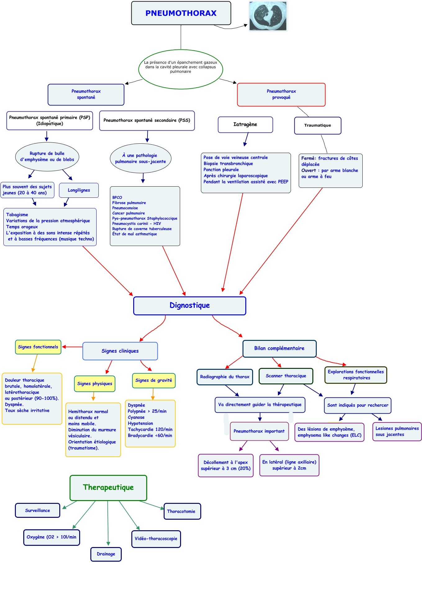 This Concept Map has information related to: Pneumothorax, Pneumothorax important ???? ????, Pose de voie veineuse centrale Biopsie transbronchique Ponction pleurale Après chirurgie laparoscopique Pendant la ventilation assisté avec PEEP ???? , Plus souvent des sujets jeunes (20 à 40 ans) ???? , Sont indiqués pour rechercer ???? ????, Therapeutique ???? , À une pathologie pulmonaire sous-jacente ???? , Pneumothorax spontané secondaire (PSS) , Bilan complémentaire ???? , PNEUMOTHORAX La présence d’un épanchement gazeux dans la cavité pleurale avec collapsus pulmonaire Pneumothorax spontané, Pneumothorax important ???? ????