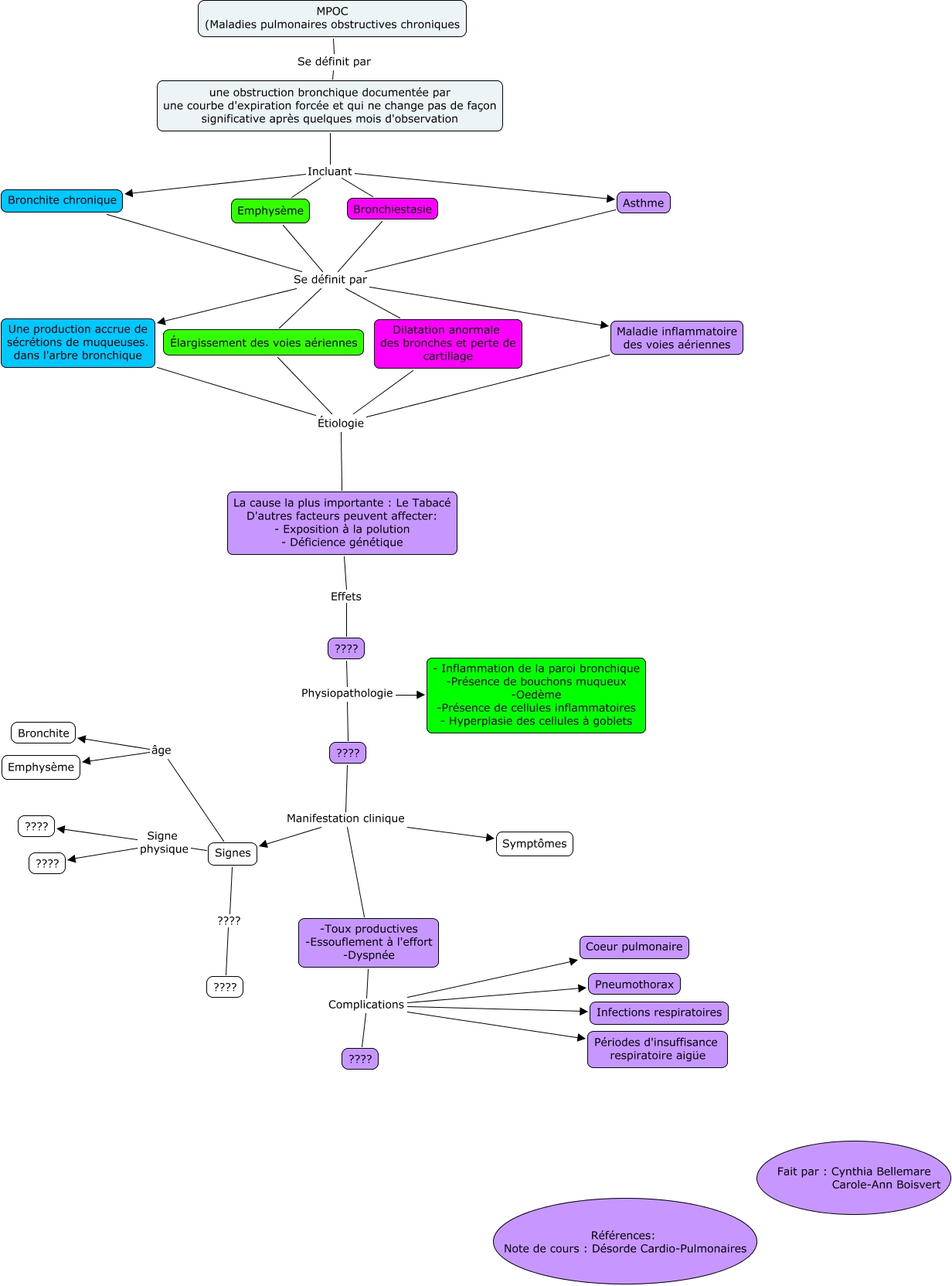 This Concept Map, created with IHMC CmapTools, has information related to: MPOC, Dilatation anormale des bronches et perte de cartillage Étiologie La cause la plus importante : Le Tabacé D'autres facteurs peuvent affecter: - Exposition à la polution - Déficience génétique, Signes Signe physique ????, ???? Manifestation clinique Symptômes, une obstruction bronchique documentée par une courbe d'expiration forcée et qui ne change pas de façon significative après quelques mois d'observation Incluant Emphysème, -Toux productives -Essouflement à l'effort -Dyspnée Complications Infections respiratoires, Asthme Se définit par Maladie inflammatoire des voies aériennes, -Toux productives -Essouflement à l'effort -Dyspnée Complications Pneumothorax, une obstruction bronchique documentée par une courbe d'expiration forcée et qui ne change pas de façon significative après quelques mois d'observation Incluant Bronchite chronique, Bronchite chronique Se définit par Maladie inflammatoire des voies aériennes, ???? Physiopathologie - Inflammation de la paroi bronchique -Présence de bouchons muqueux -Oedème -Présence de cellules inflammatoires - Hyperplasie des cellules à goblets, Bronchite chronique Se définit par Dilatation anormale des bronches et perte de cartillage, ???? Manifestation clinique -Toux productives -Essouflement à l'effort -Dyspnée, une obstruction bronchique documentée par une courbe d'expiration forcée et qui ne change pas de façon significative après quelques mois d'observation Incluant Asthme, -Toux productives -Essouflement à l'effort -Dyspnée Complications ????, Emphysème Se définit par Élargissement des voies aériennes, -Toux productives -Essouflement à l'effort -Dyspnée Complications Coeur pulmonaire, Emphysème Se définit par Une production accrue de sécrétions de muqueuses. dans l'arbre bronchique, Emphysème Se définit par Dilatation anormale des bronches et perte de cartillage, Emphysème Se définit par Maladie inflammatoire des voies aériennes, La cause la plus importante : Le Tabacé D'autres facteurs peuvent affecter: - Exposition à la polution - Déficience génétique Effets ????