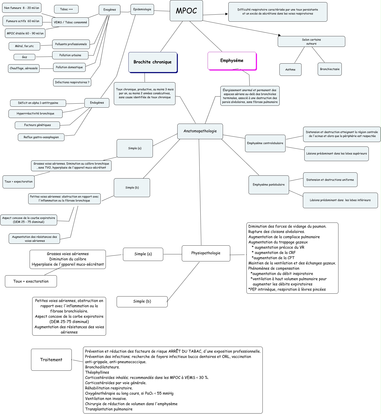 This Concept Map has information related to: MPOC, Emphyséme Élargissement anormal et permanent des espaces aériens au-delà des bronchioles terminales, associé à une destruction des parois alvéolaires, sans fibrose pulmonaire, Lésions prédominant dans les lobes supérieurs ???? Emphyséme centrolobulaire, Selon certains auteurs ???? Bronchiectasie, Epidemiologie ???? Exogènes, ???? Emphyséme centrolobulaire, Simple (a) ???? , Exogènes ???? Pollution domestique, Anatomopathologie ???? , Anatomopathologie ???? , Exogènes ???? Pollution urbaine